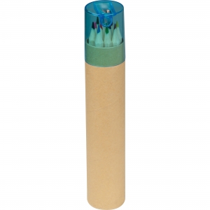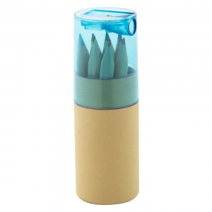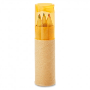 7-teiliges Set in einer zylinderförmigen Box aus Naturkarton mit transparentem Deckel in verschiedenen Farben. Enthält 6 Buntstifte mit sechseckigem Schaft in Naturfarbe und einen im Deckel integrierten Anspitzer.
