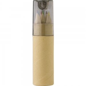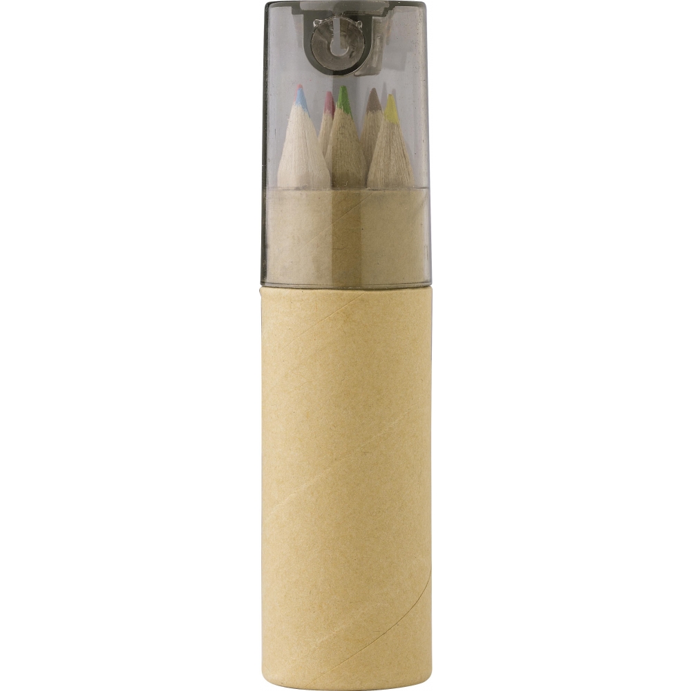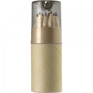 Karton-Köcher mit 6 unlackierten Buntstiften, 6 Wachsstiften und einem Anspitzer.