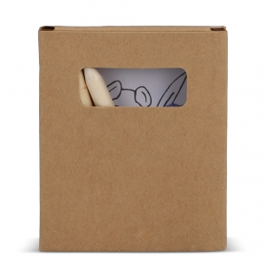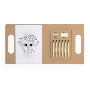 Malset aus recyceltem Karton. Inklusive einem verspielten Satz Zeichnungen und Buntstiften in einer praktischen Mappe mit Griffen. Inhalt: 20-Blatt-Block mit Naturzeichnungen zum Ausmalen. Box mit 6 Holzstiften in verschiedenen Farben. Anspitzer. Radiergummi.