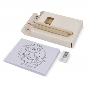 Malset mit 6 Holzbuntstiften, Anspitzer aus Holz und kleinem Block mit 20 Ausmalbögen aus Recyclingpapier mit unterschiedlichen Motiven.