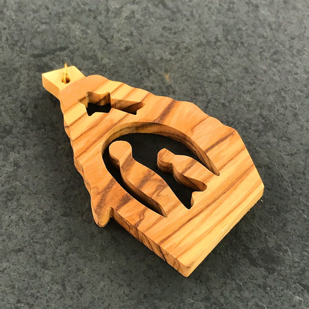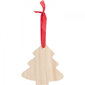 Weihnachtsbaumanhänger 'X-MAS Tree' aus Holz in Tannenbaum-Form. Der Anhänger ist mit einem roten Bändchen versehen, an dem er einfach aufgehängt werden kann.