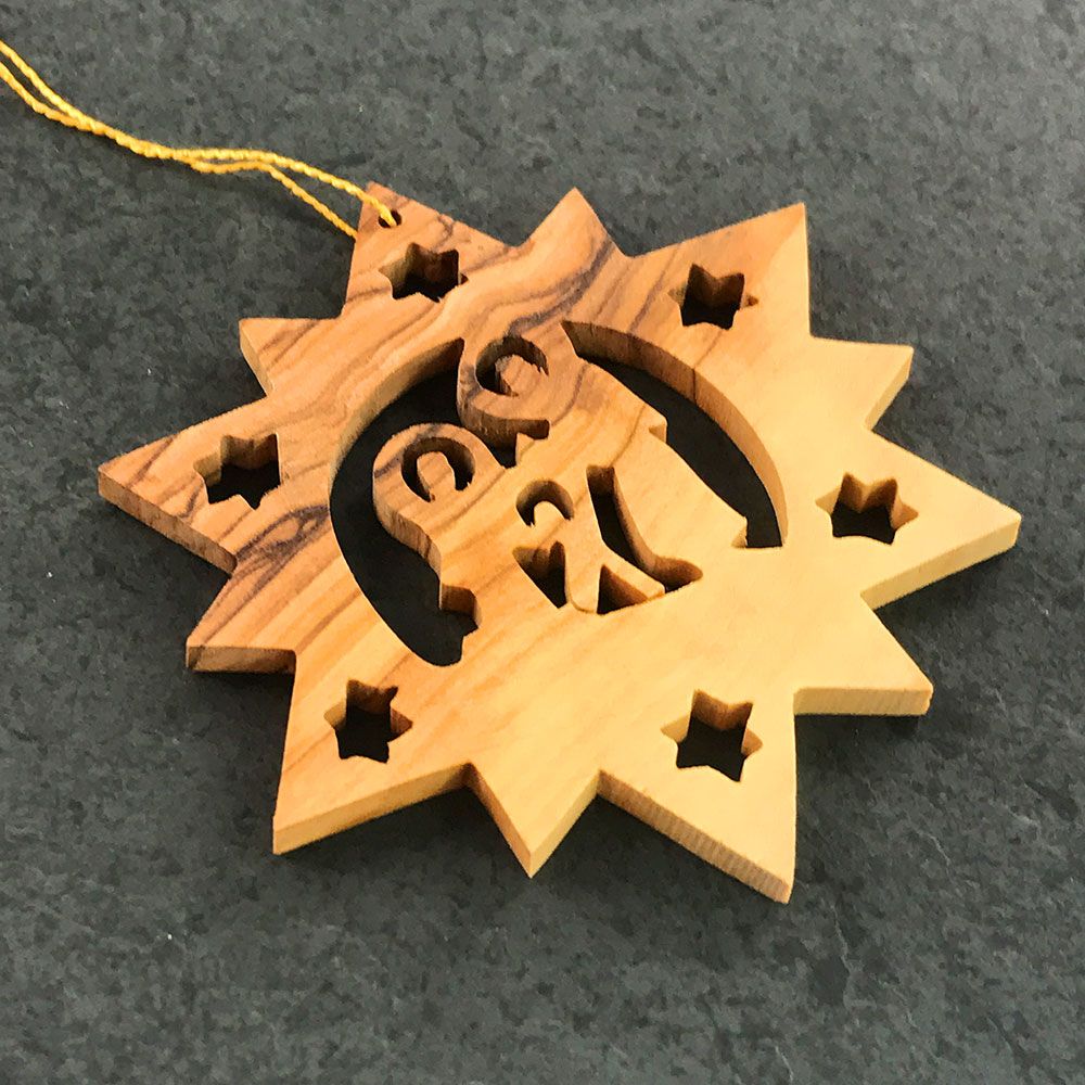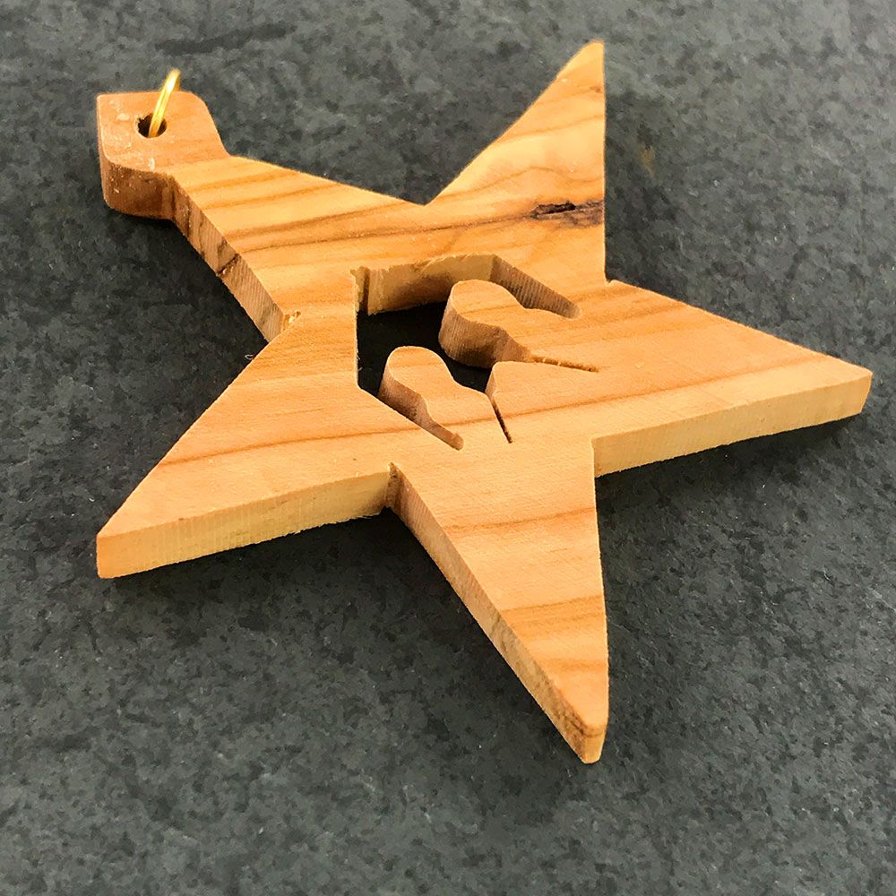 Weihnachtsbaumanhänger 'X-MAS Star' aus Holz in Stern-Form. Der Anhänger ist mit einem roten Bändchen versehen, an dem er einfach aufgehängt werden kann.