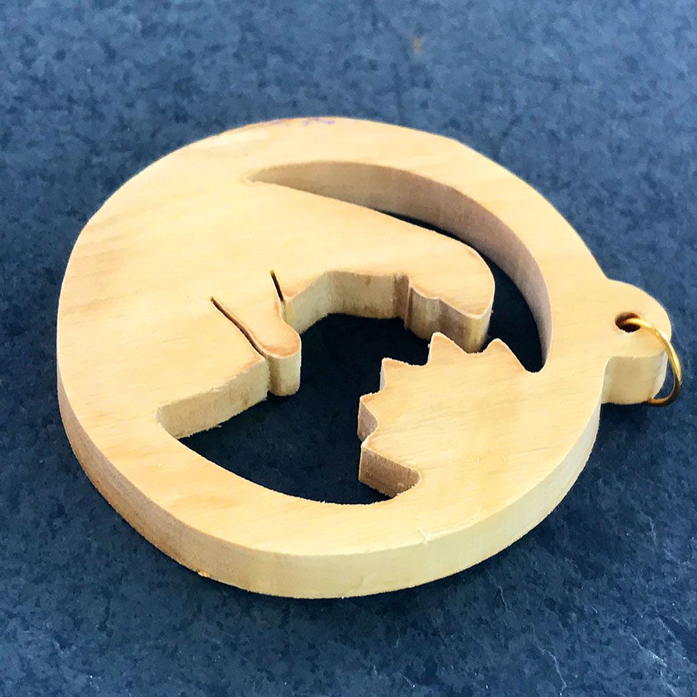 Individueller, zweilagiger Weihnachtsbaumanhänger aus RPET-Filz und Birkensperrholz mit silberner Schleife und gestanztem Weihnachtsmotiv. Der Preis ist inklusive UV-LED-Druck auf dem Holzteil. Mindestmenge: 100 Stk.