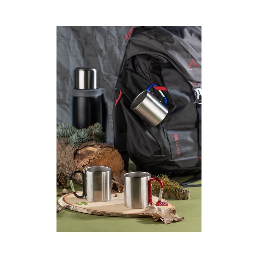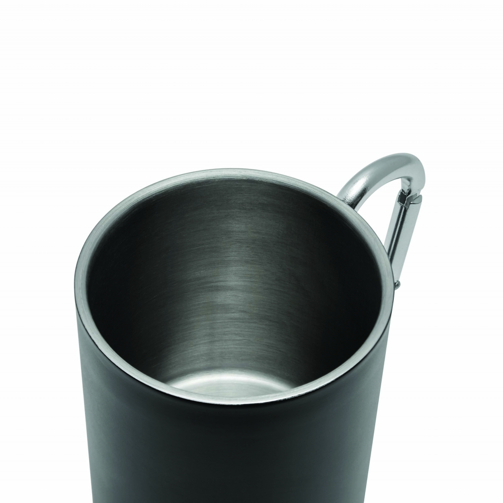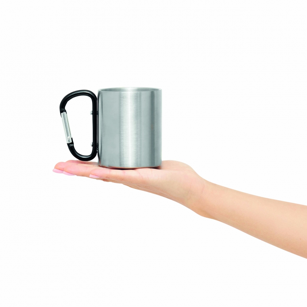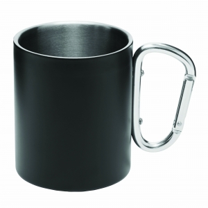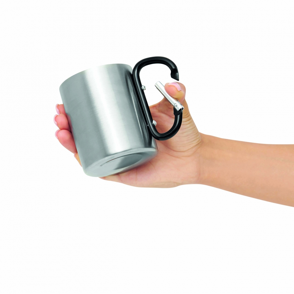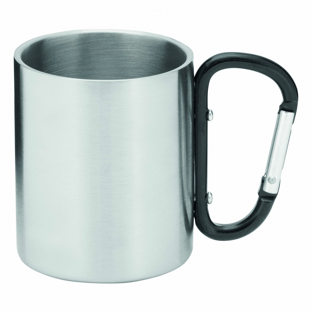 Doppelwandiger Trinkbecher aus Edelstahl. Henkel mit Karabiner. Füllmenge: 220 ml. Der Karabiner ist NICHT als Sicherung beim Klettern geeignet.