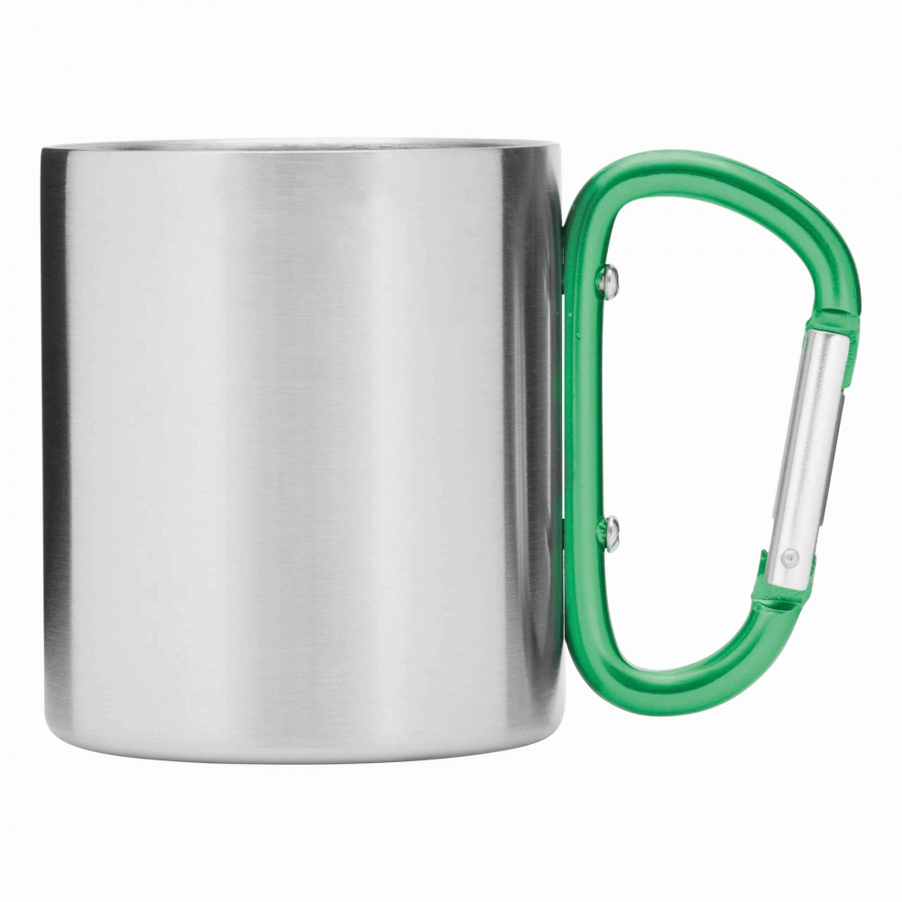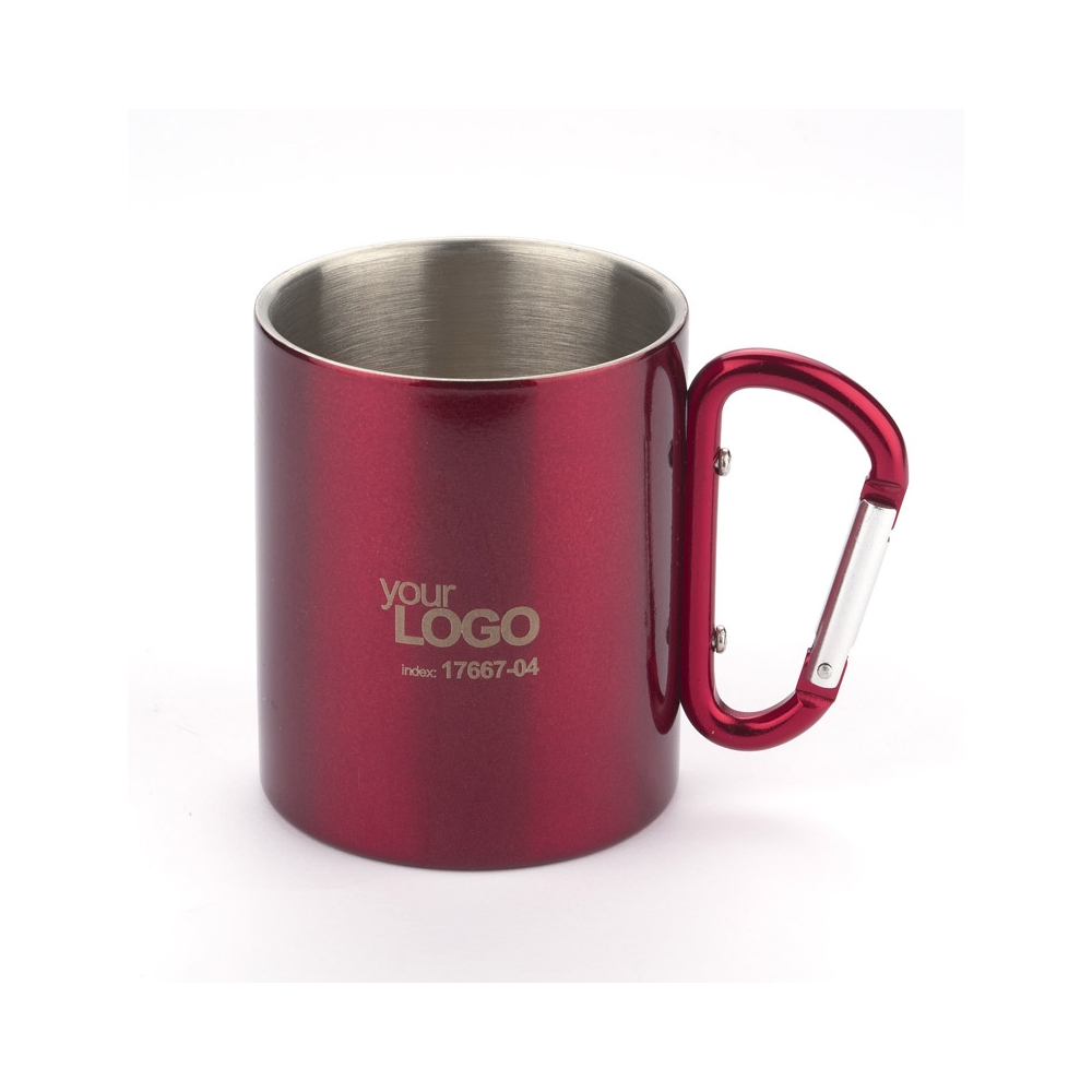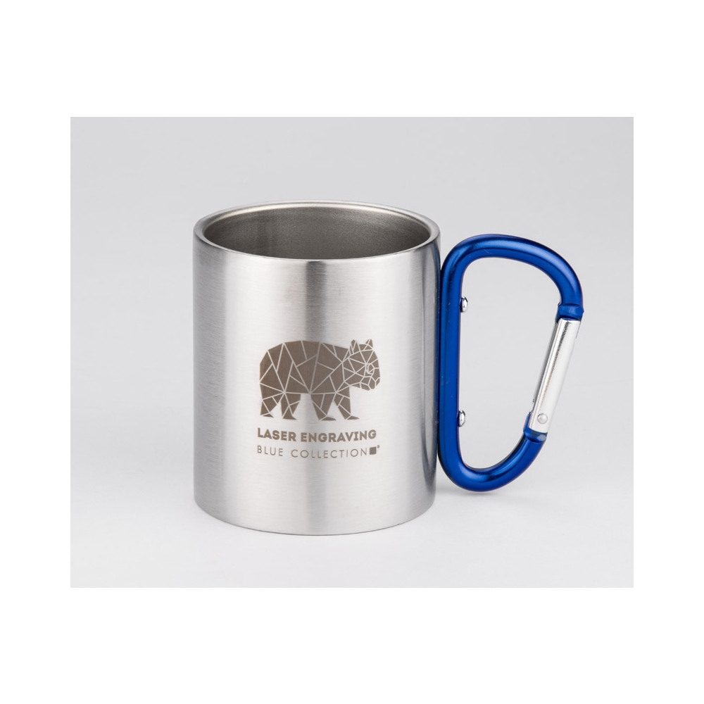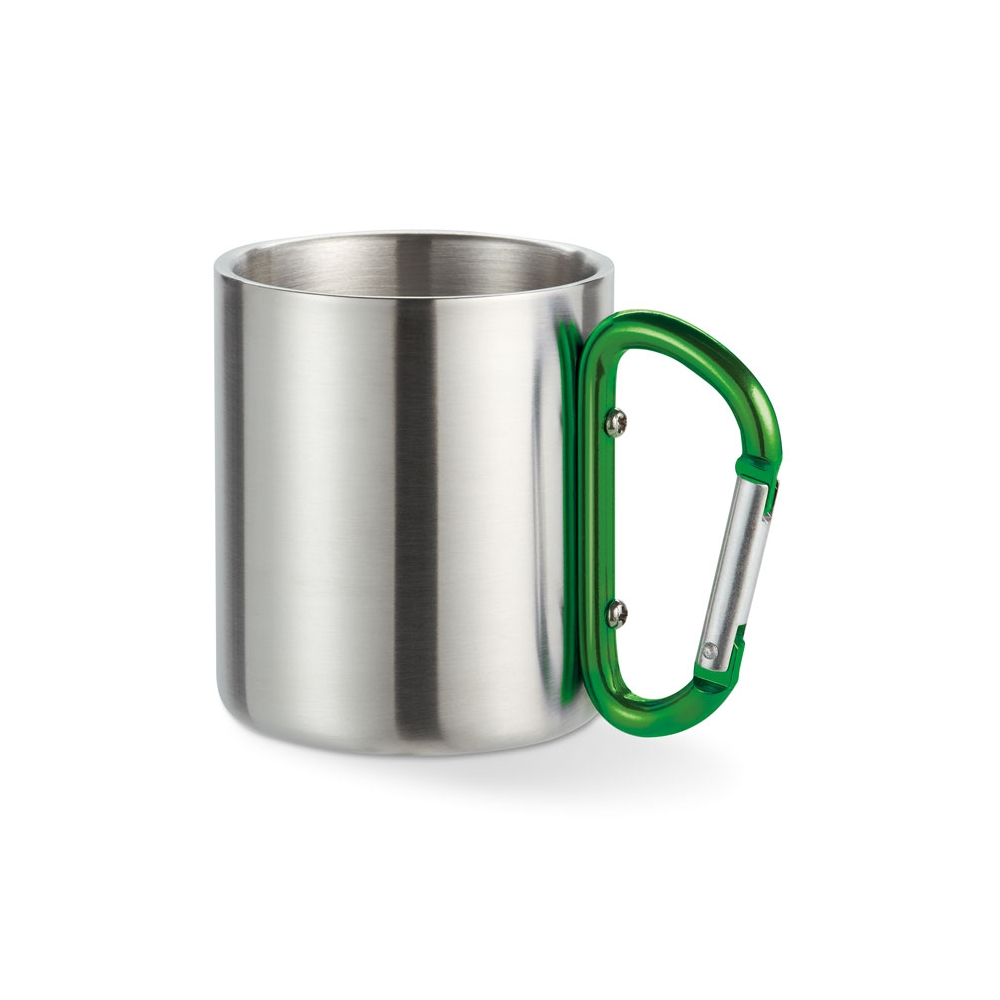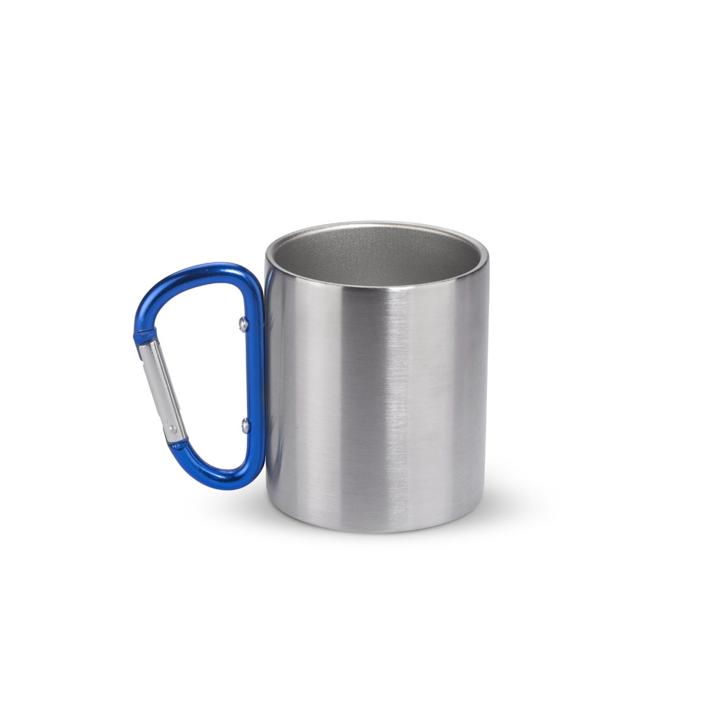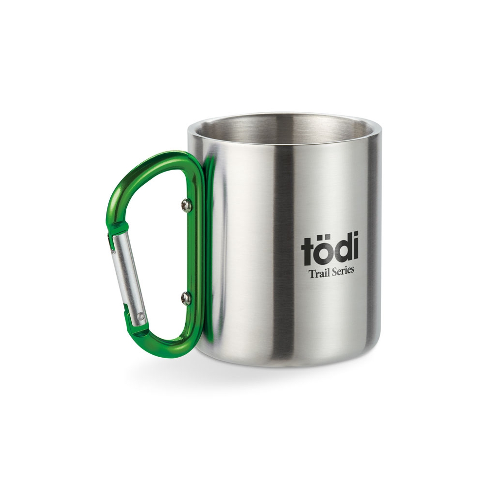 Doppelwandiger Trinkbecher aus Edelstahl. Henkel mit Karabiner. Füllmenge: 220 ml. Der Karabiner ist NICHT als Sicherung beim Klettern geeignet.