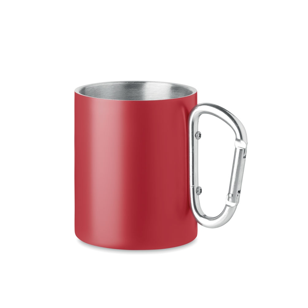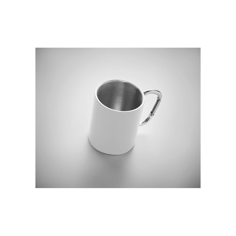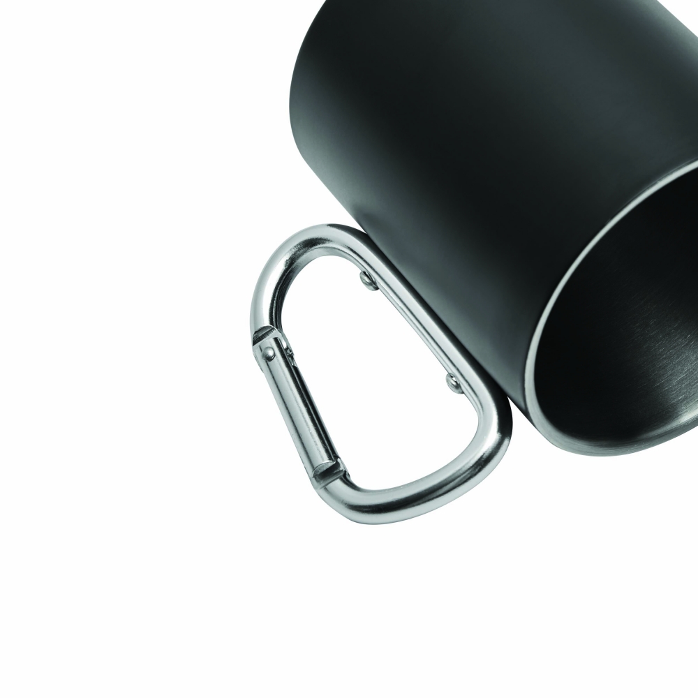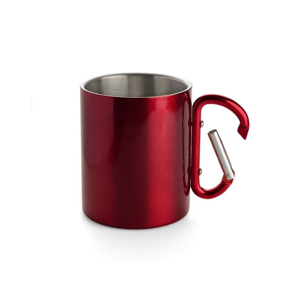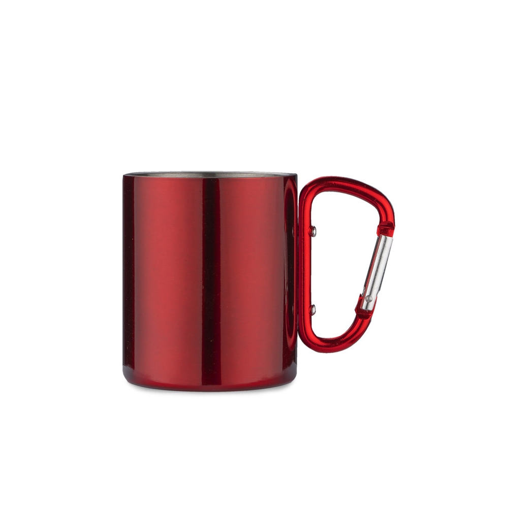 Doppelwandiger Trinkbecher aus Edelstahl. Henkel mit Karabiner. Füllmenge: 220 ml. Der Karabiner ist NICHT als Sicherung beim Klettern geeignet.
