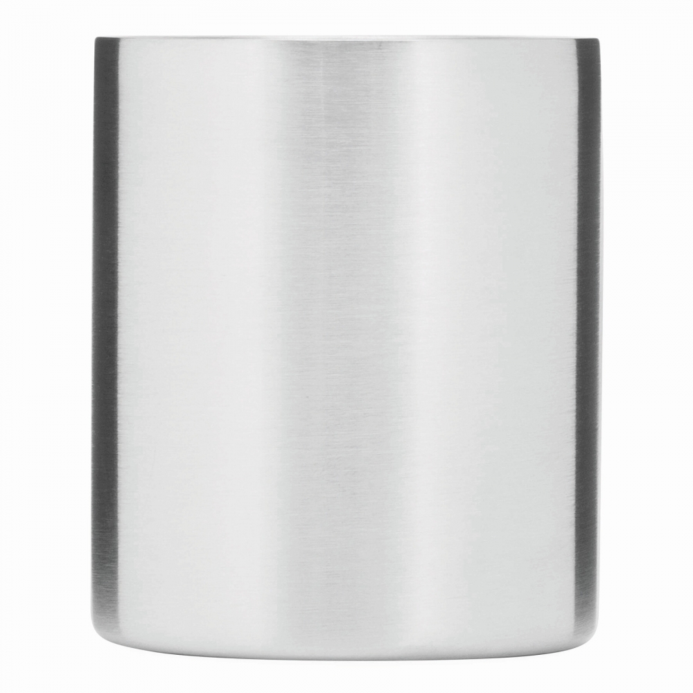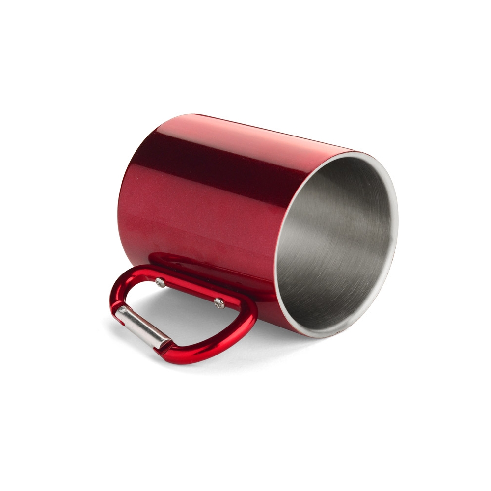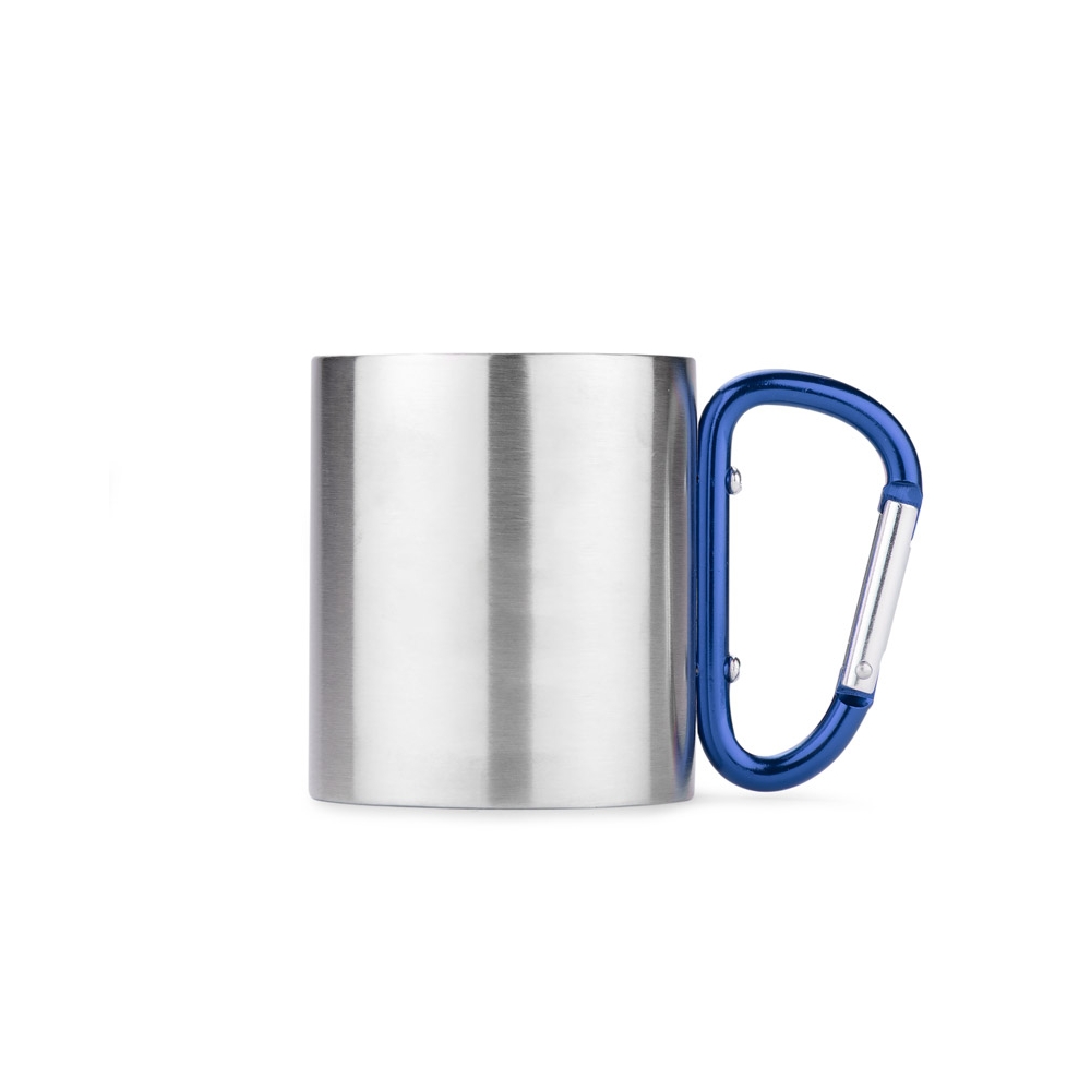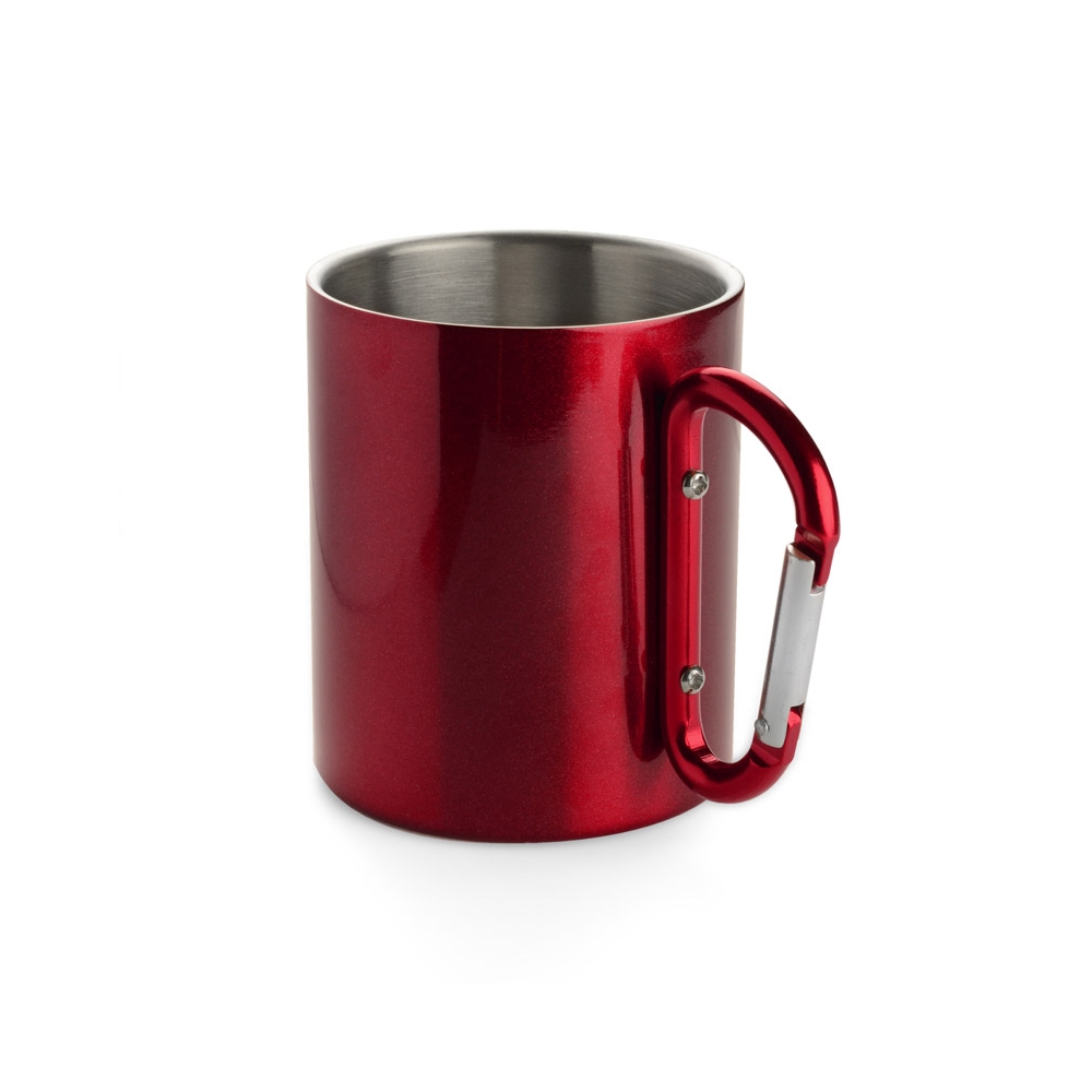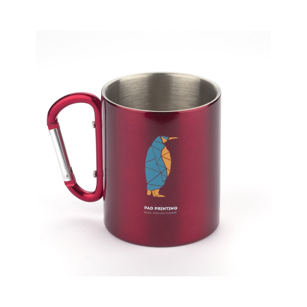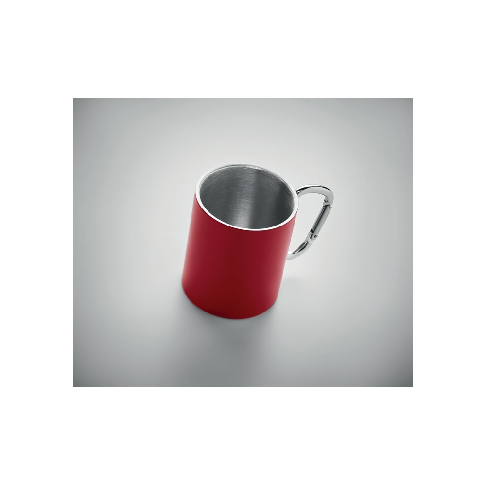 Doppelwandiger Trinkbecher aus Edelstahl. Henkel mit Karabiner. Füllmenge: 220 ml. Der Karabiner ist NICHT als Sicherung beim Klettern geeignet.
