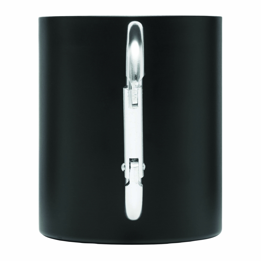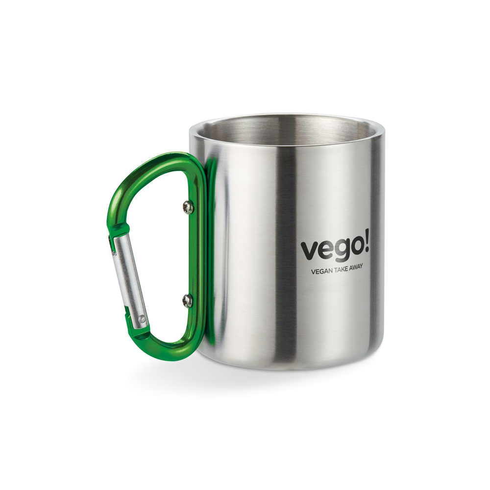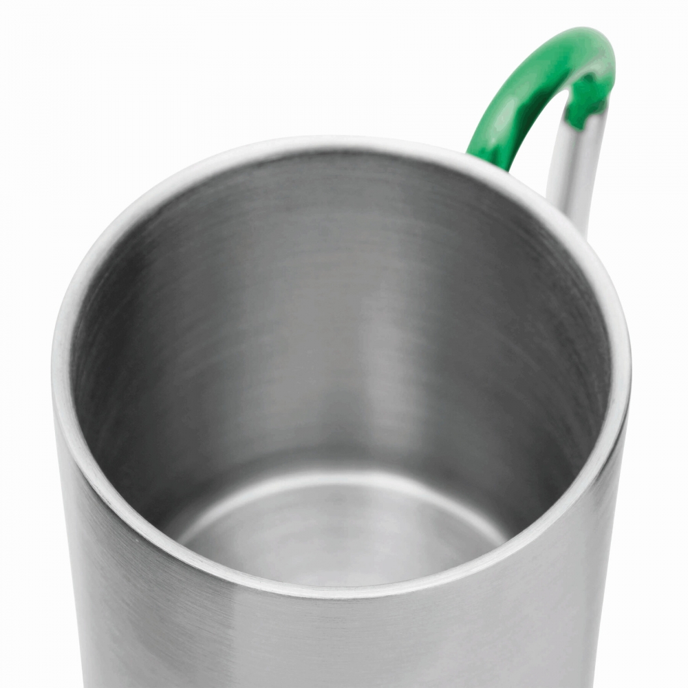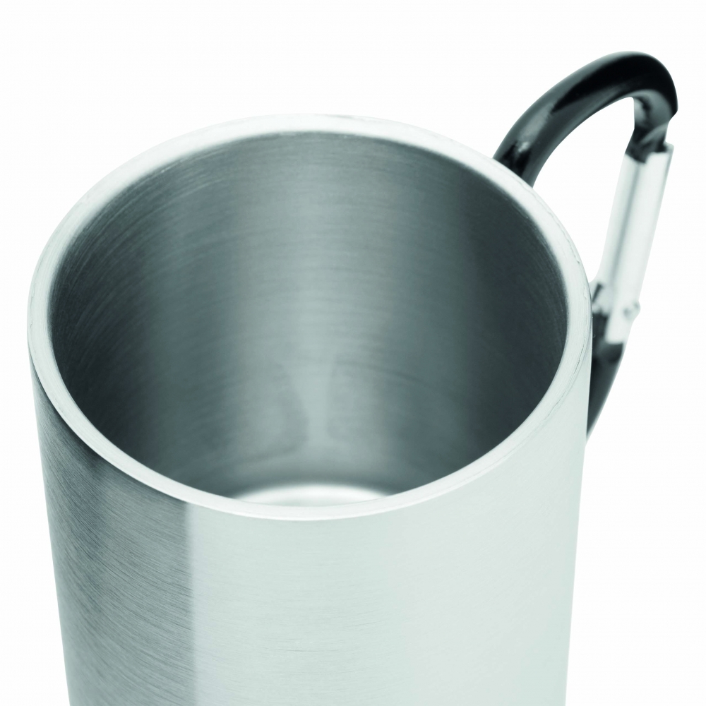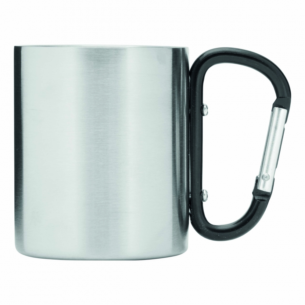 Doppelwandiger Trinkbecher aus Edelstahl. Henkel mit Karabiner. Füllmenge: 300 ml. Der Karabiner ist NICHT als Sicherung beim Klettern geeignet.
