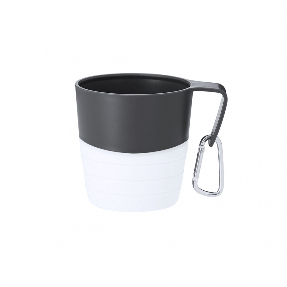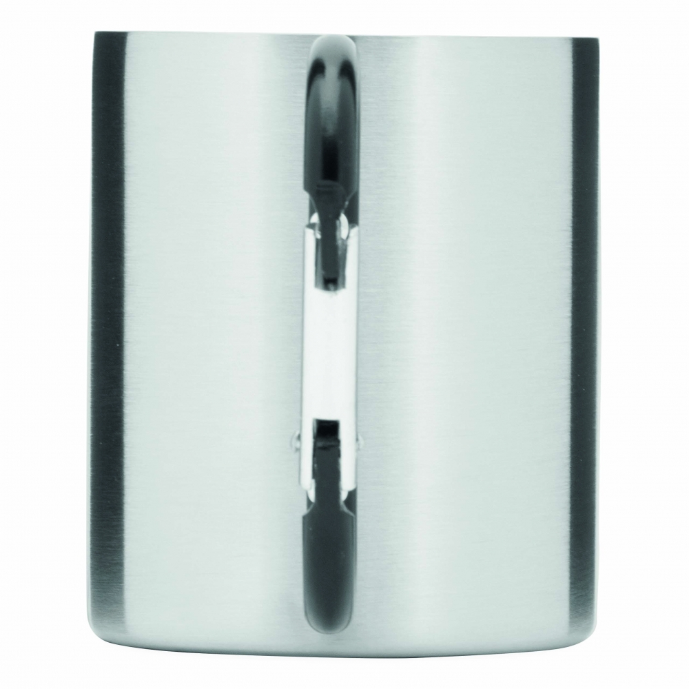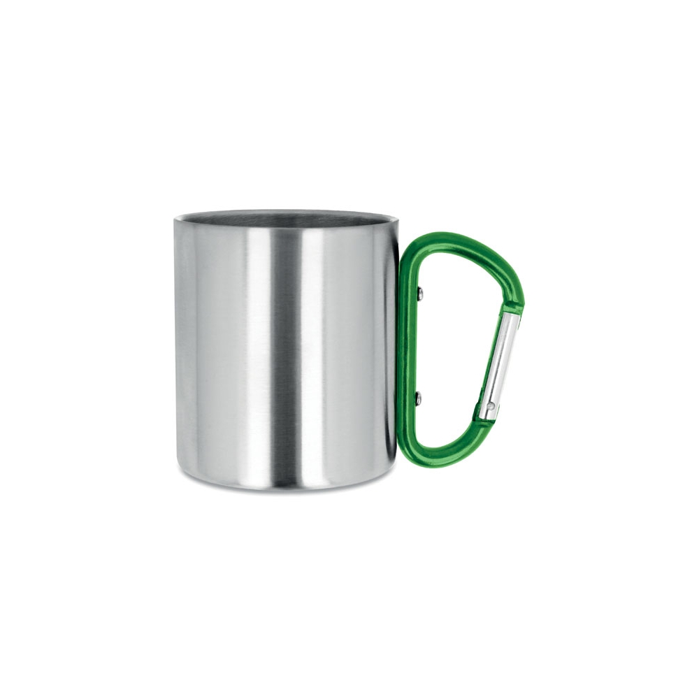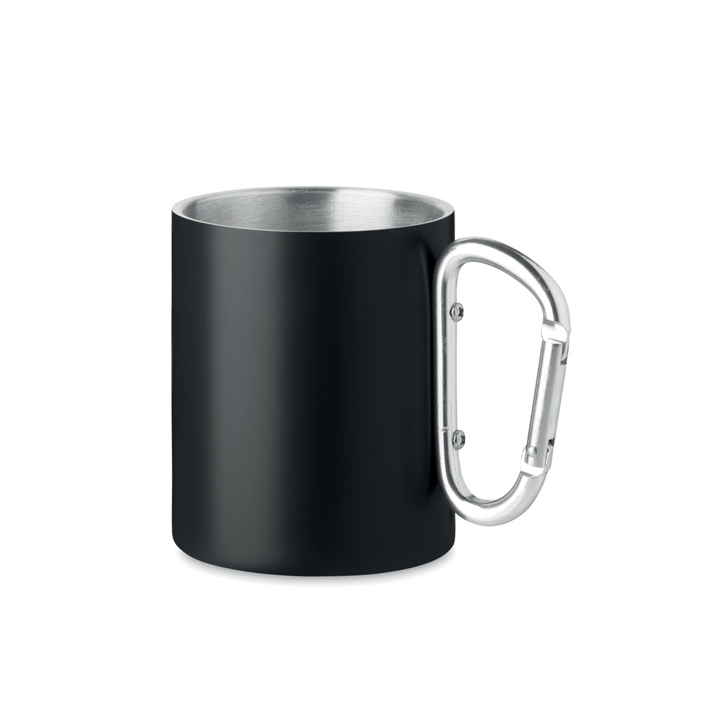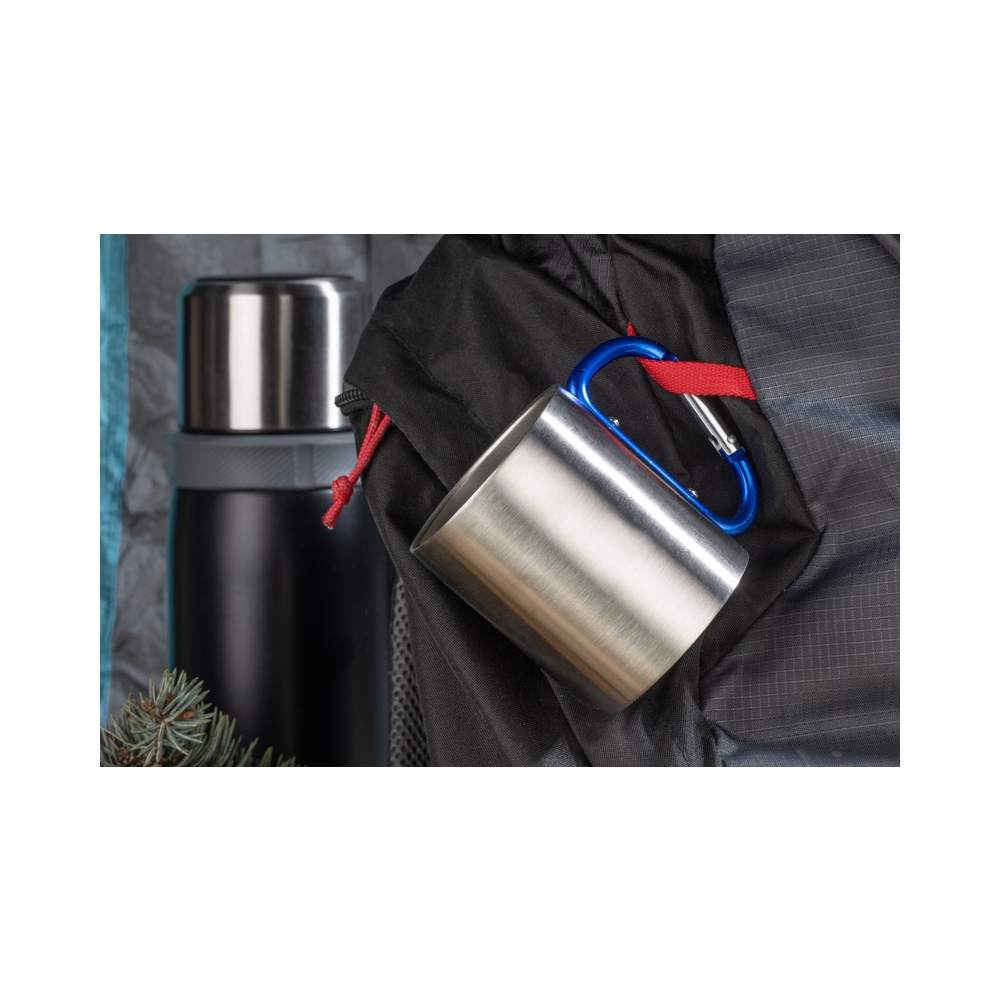 Doppelwandiger Trinkbecher aus Edelstahl. Henkel mit Karabiner. Füllmenge: 300 ml. Der Karabiner ist NICHT als Sicherung beim Klettern geeignet.