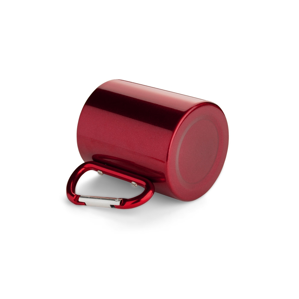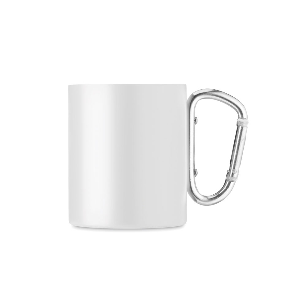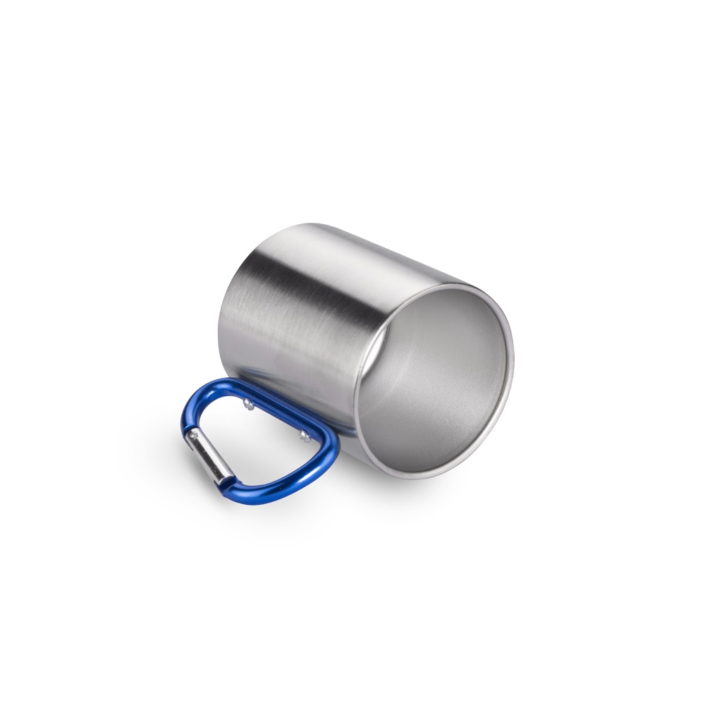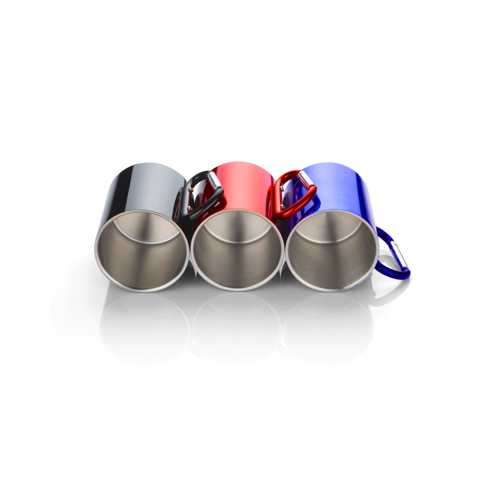 Edelstahlbecher mit 220 ml Fassungsvermögen mit metallisch glänzender Oberfläche und funktionellem Karabinergriff in verschiedenen Farben, der das Tragen erleichtert. Präsentiert in einer Schachtel aus Kraftkarton.