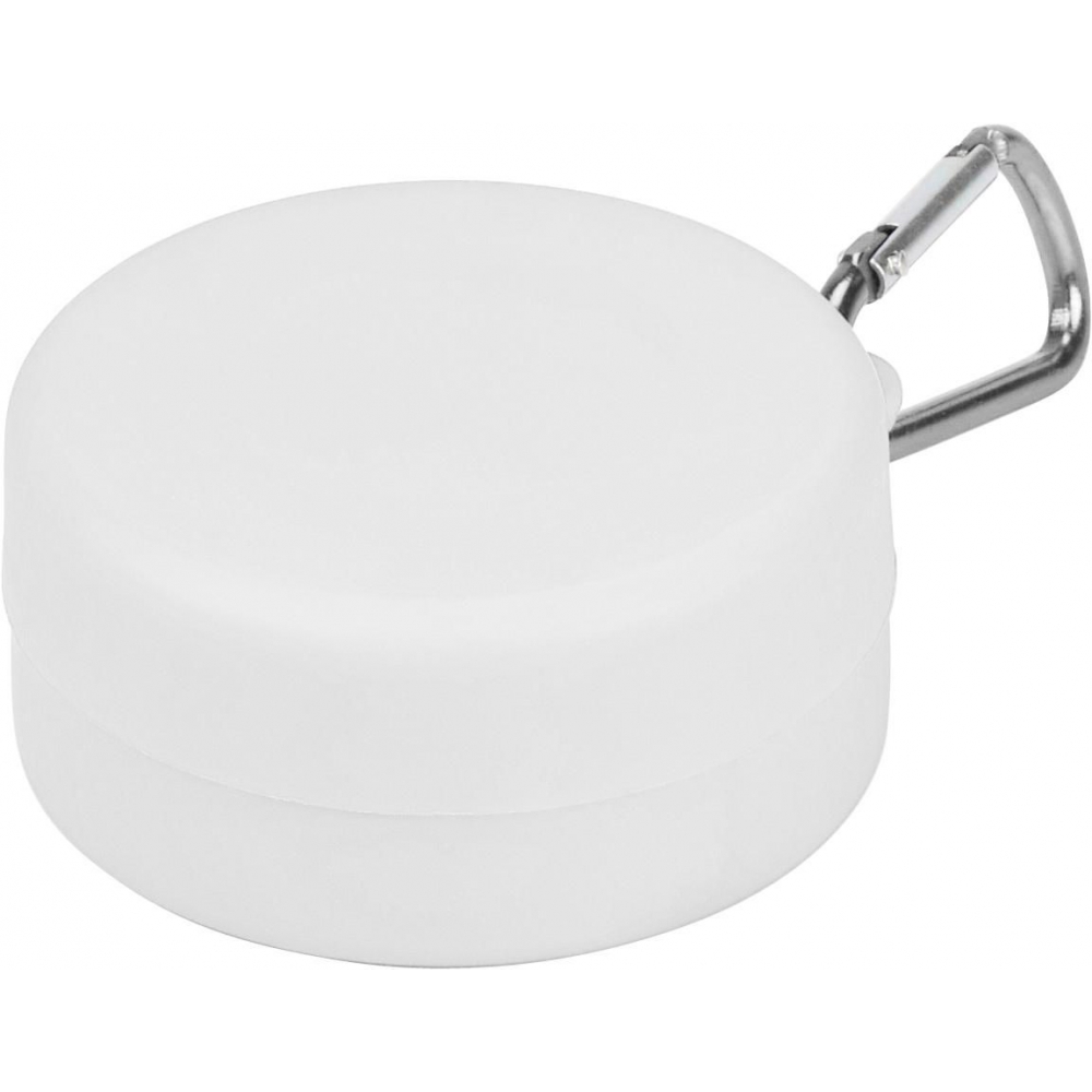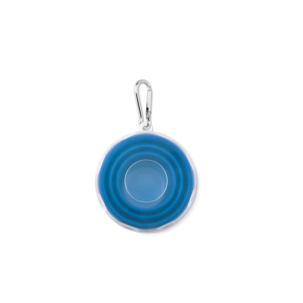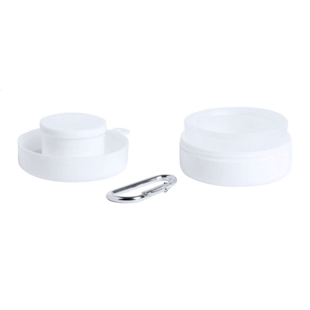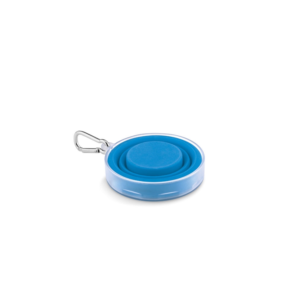 Faltbarer Becher aus Silikon inkl. Pillendosierer. Mit Karabiner.