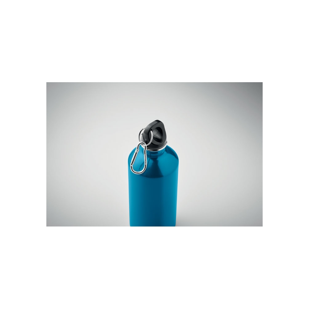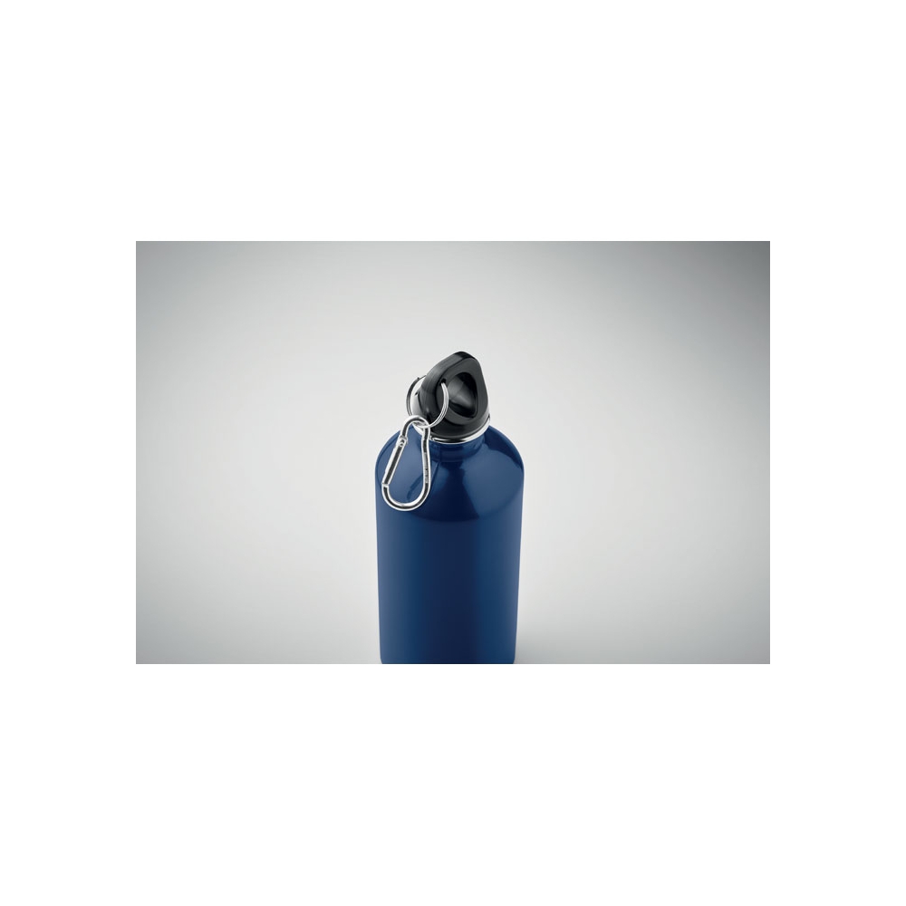 Einwandige Trinkflasche aus recyceltem Edelstahl (90 % recycelter Edelstahl und 10 % Edelstahl) mit Karabiner. Füllmenge: 500 ml. Sublimationsdruck nur auf weißem Material möglich. Auslaufsicher. Der Karabiner ist NICHT als Sicherung beim Klettern geeignet. Da der einwandige Becher die Hitze nach Außen leiten kann, kann der Artikel heiß werden.