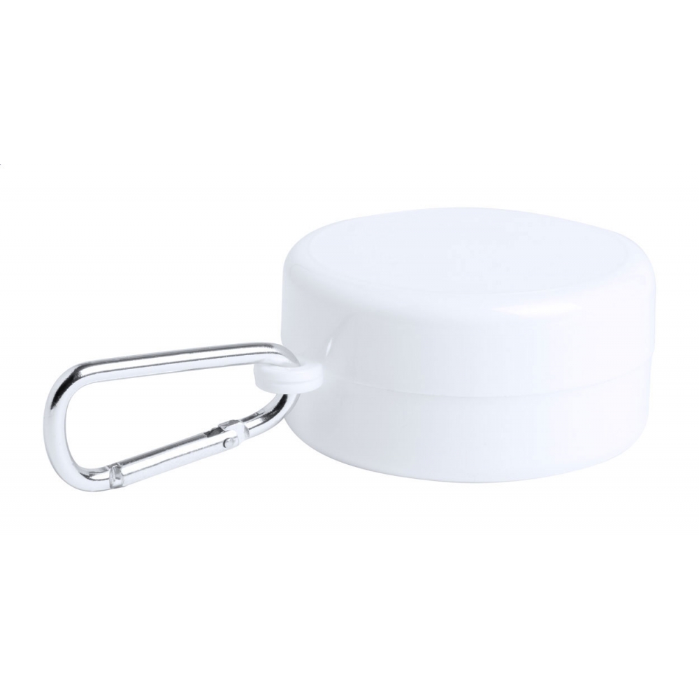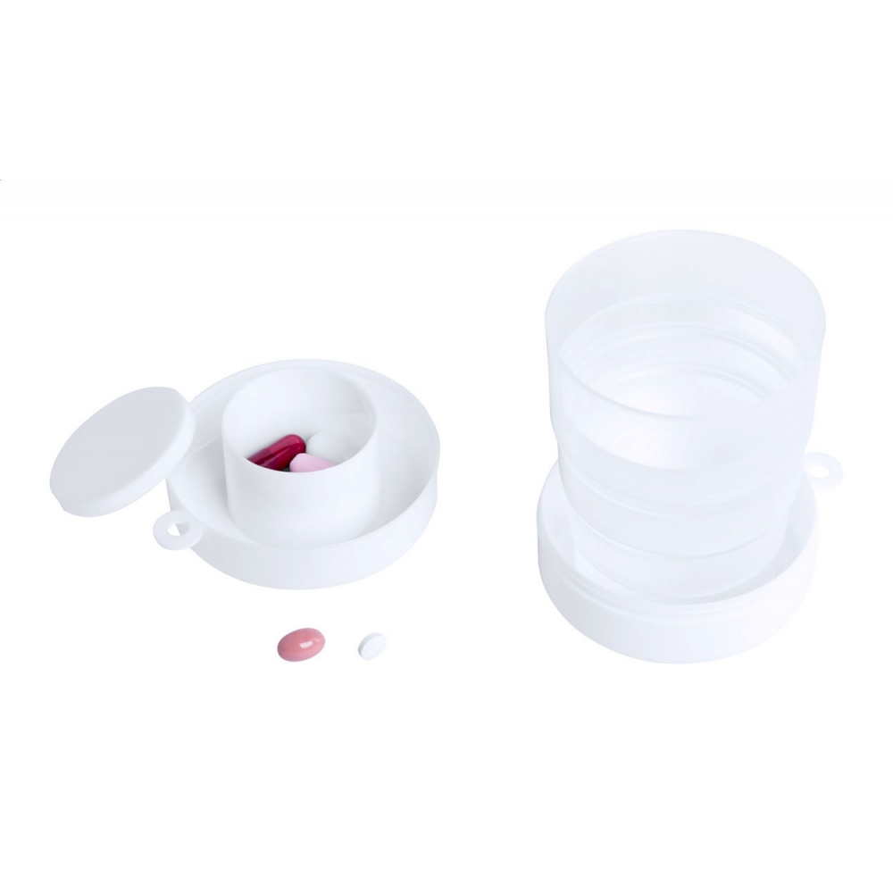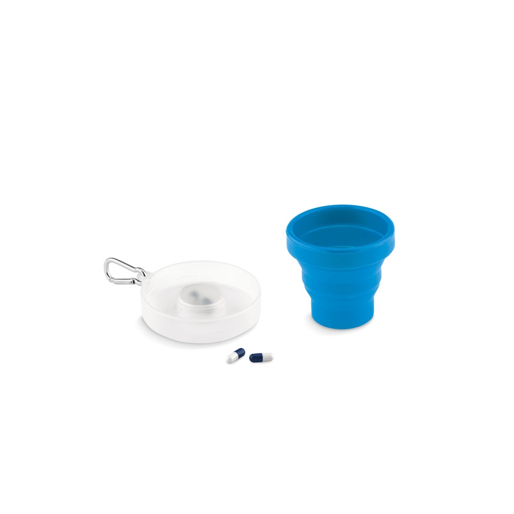 Faltbarer Kunststoff-Becher (220 ml) mit Tablettenfächern. Einzeln in Kunststoffetui mit Karabiner.