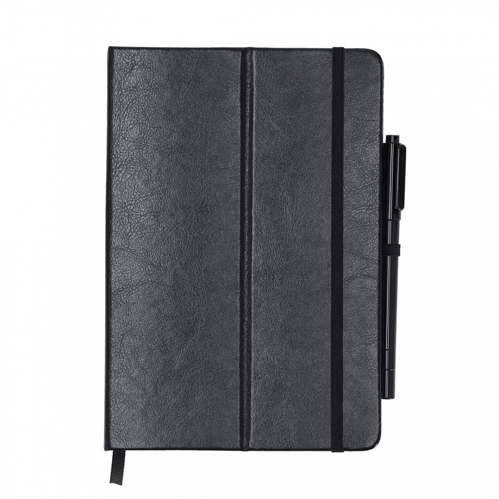 Blackboard-Notizblock in recycelter PU. Mit einer Tafel auf der ersten Seite enthält sie einen Markerstift und einen Radiergummi in schwarzer Tinte. Mit 80 Blättern in einem Streifen. Faltbare Abdeckung mit Stützfunktion und elastisches Band für sicheren Verschluss. Ideal, um schnell Notizen zu machen, Notizen, Designs am Arbeitstag oder zu Hause zu erstellen. Enthält das charakteristische PU Recycled Logo.