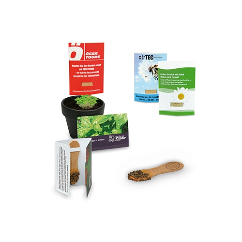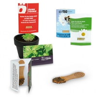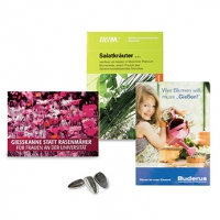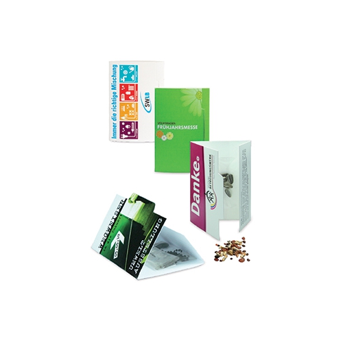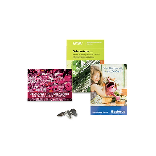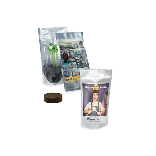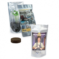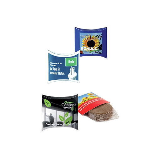 Inhalt: Flowerbag mit Erdtablette, Samen: Zwergsonnenblume oder Fichte, Format: 85 x 140 x 10 mm, Gewicht: ca. 21 g, Werbefläche: 70 x 20 mm Vorderseite auf dem Standardmotiv, Alternative: 195 x 62 mm eigene Gestaltung auf Banderole
