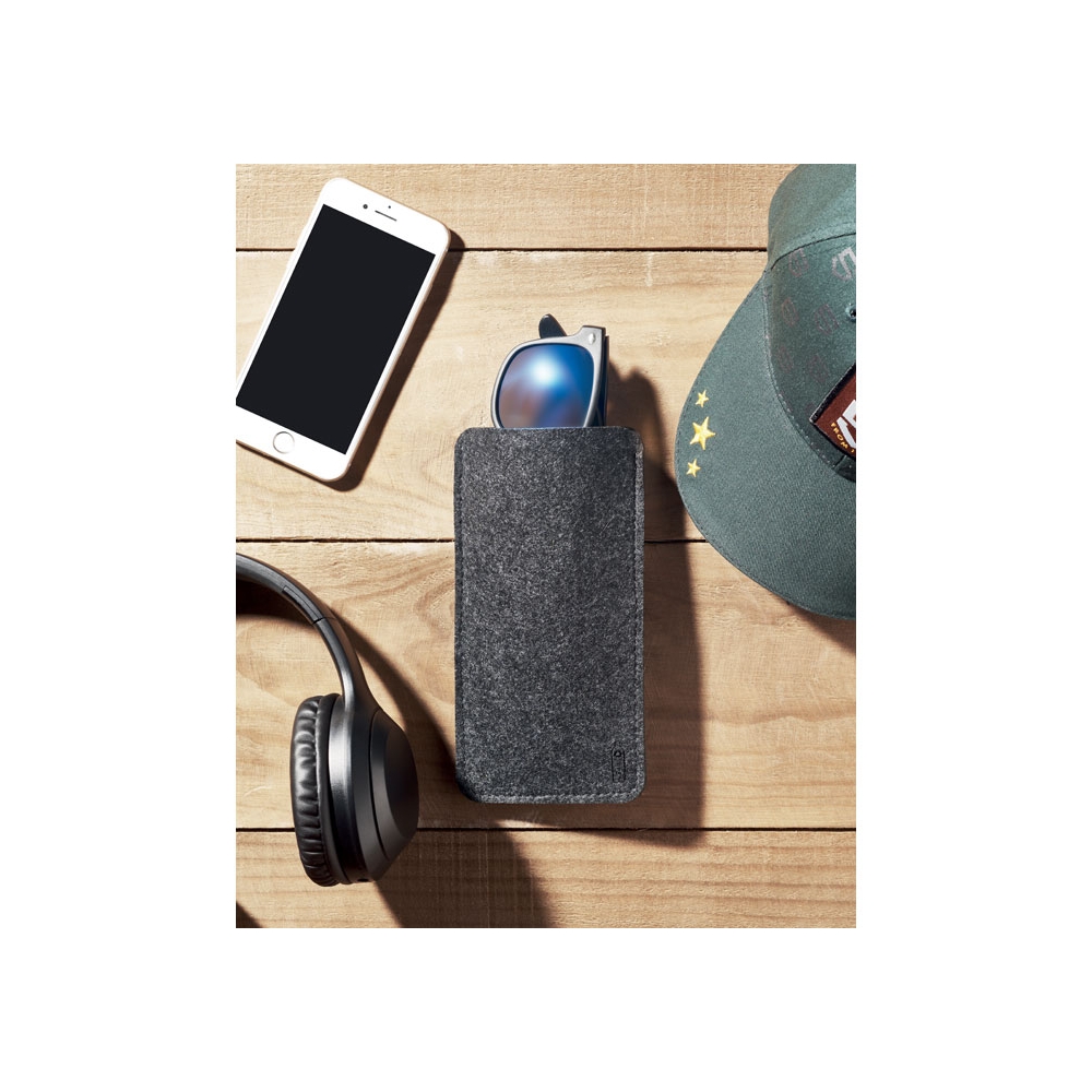 Ansprechendes Brillenetui aus hochwertigem, weichem und strapazierfähigem Recyclingfilz, GRS-zertifiziert. Mit offener Tasche, in die die Brille bei Nichtgebrauch zum Schutz einfach hineingeschoben werden kann.