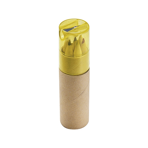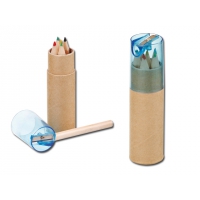 6 Farbstifte in zylinderförmigem Karton mit Spitzer im Kunststoffdeckel.