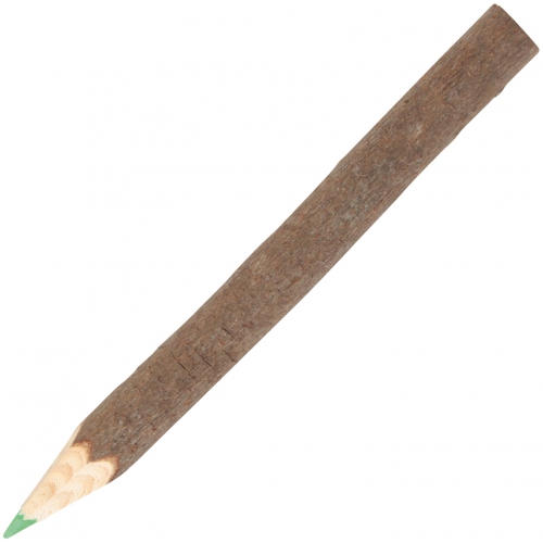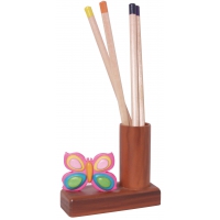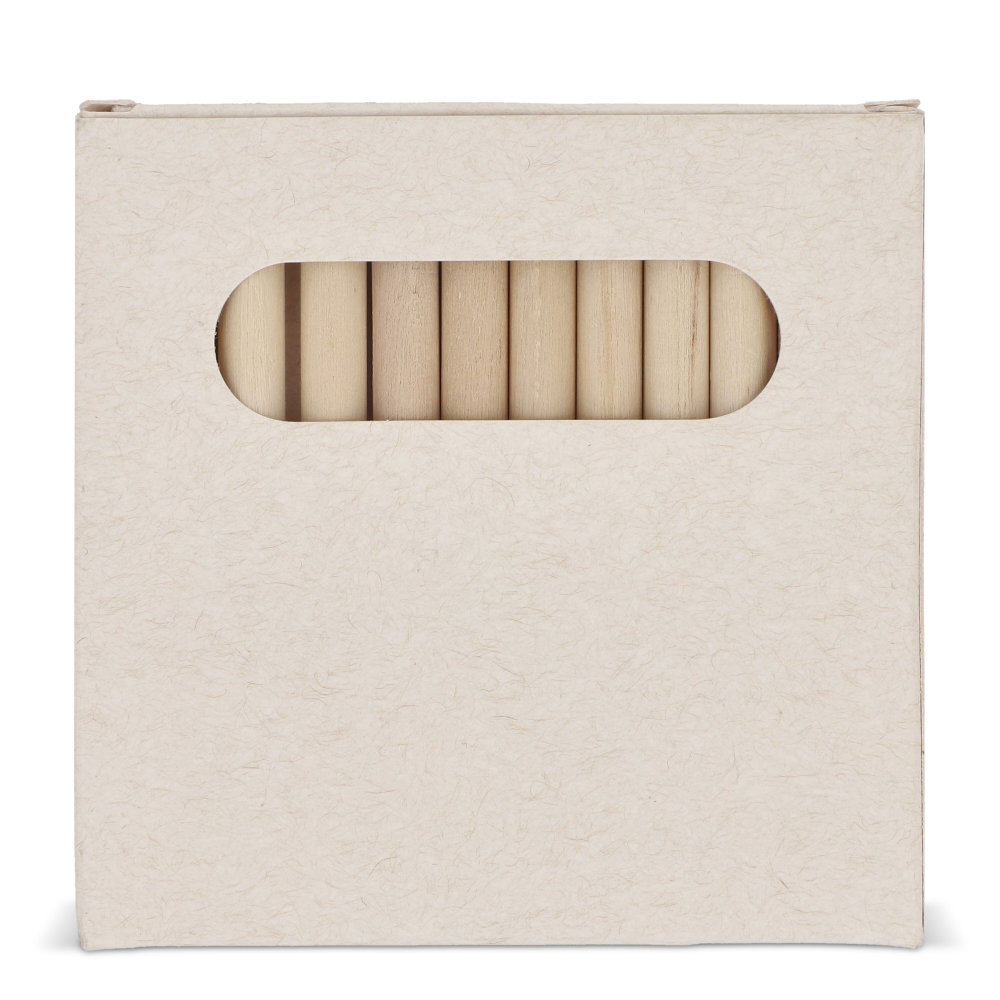 12 Farbstifte in zylinderförmigem Stiftebox aus Holz.