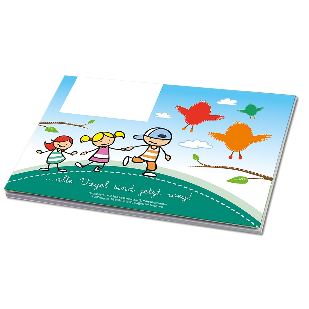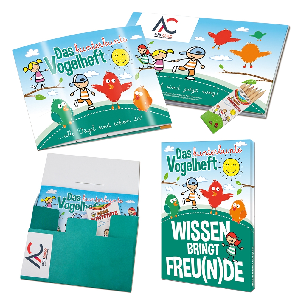 Mit unseren Wissen-Sets "Das Vogelheft" lernen Kinder spielerisch die faszinierende Welt der heimischen Vögel kennen. Die 20-seitige Broschüre bietet spannende Fakten und liebevoll gestaltete Ausmalmotive. Zwei Varianten stehen zur Auswahl: • Wissen-Heft einzeln. • Wissen-Set: Enthält zusätzlich eine praktische 6er-Buntstiftbox (Standardgestaltung), geliefert in einer hochwertigen, bedruckten Mappe. Veredelungsmöglichkeiten: • Standardausführung: Ab Lager lieferbar, optional mit zusätzlichem Logoeindruck. • Individuelle Gestaltung: Ab 500 Stück mit personalisierten Außenseiten für ein einzigarti ...