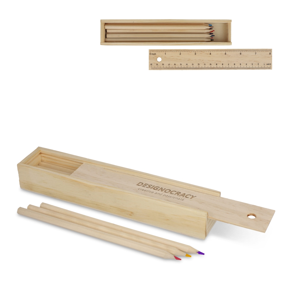 Dieses 12 Buntstiften Set wird in einer stilvollen Holzschiebebox geliefert. Die Box ist ideal für Künstler und Bastler und bietet eine raffinierte Aufbewahrungslösung, die sowohl funktional als auch großartig für das Branding ist. Sie ist ideal zum Verschenken und enthält einen 20 cm Lineal im Deckel.