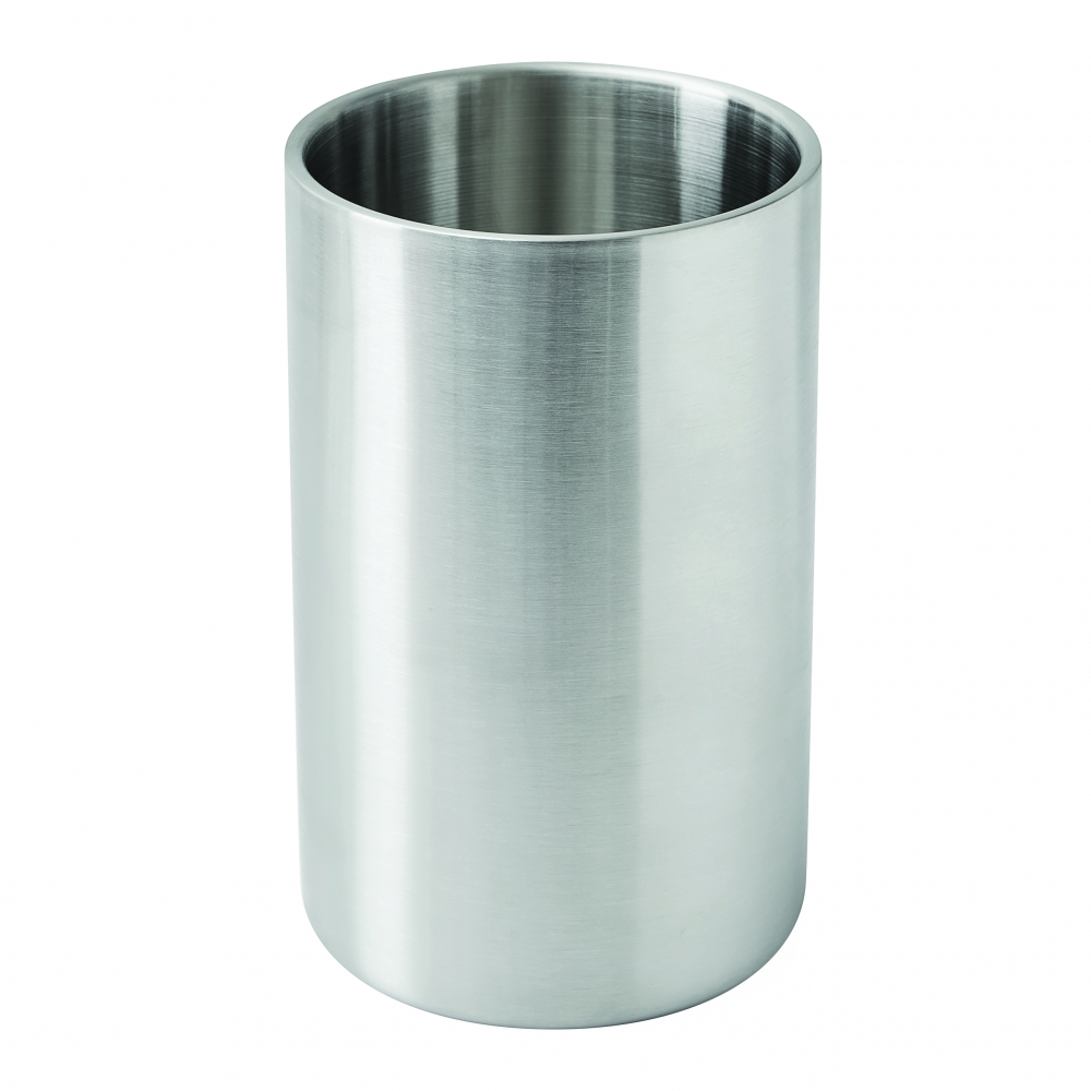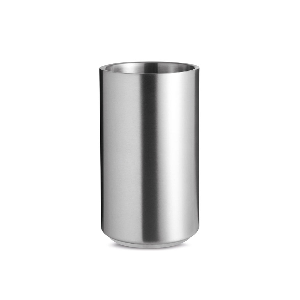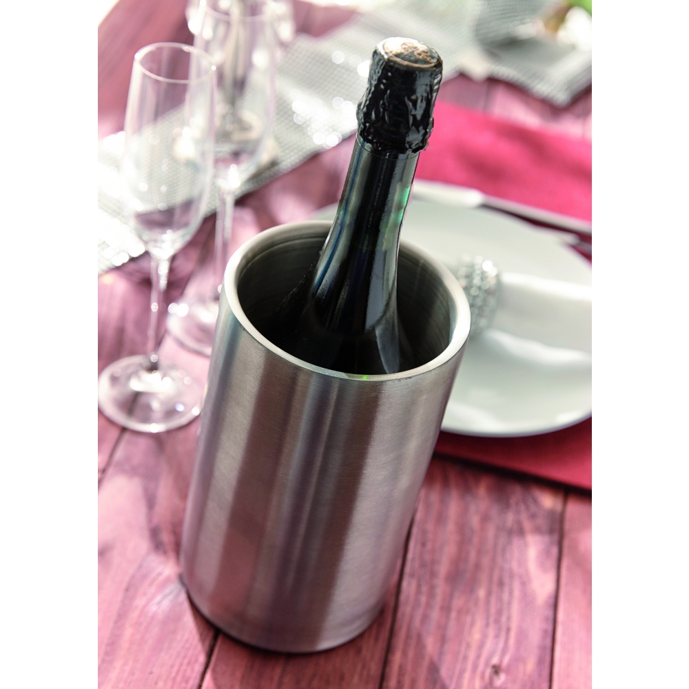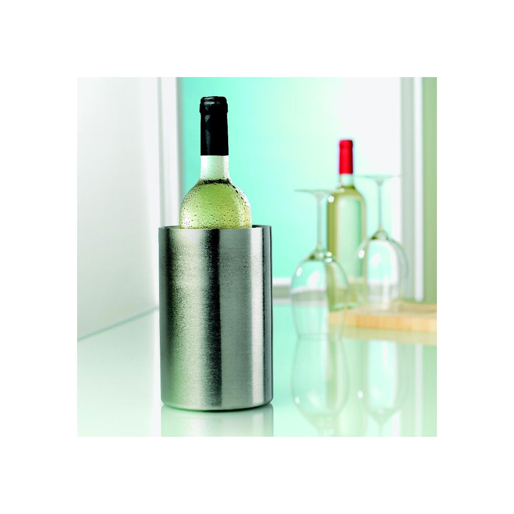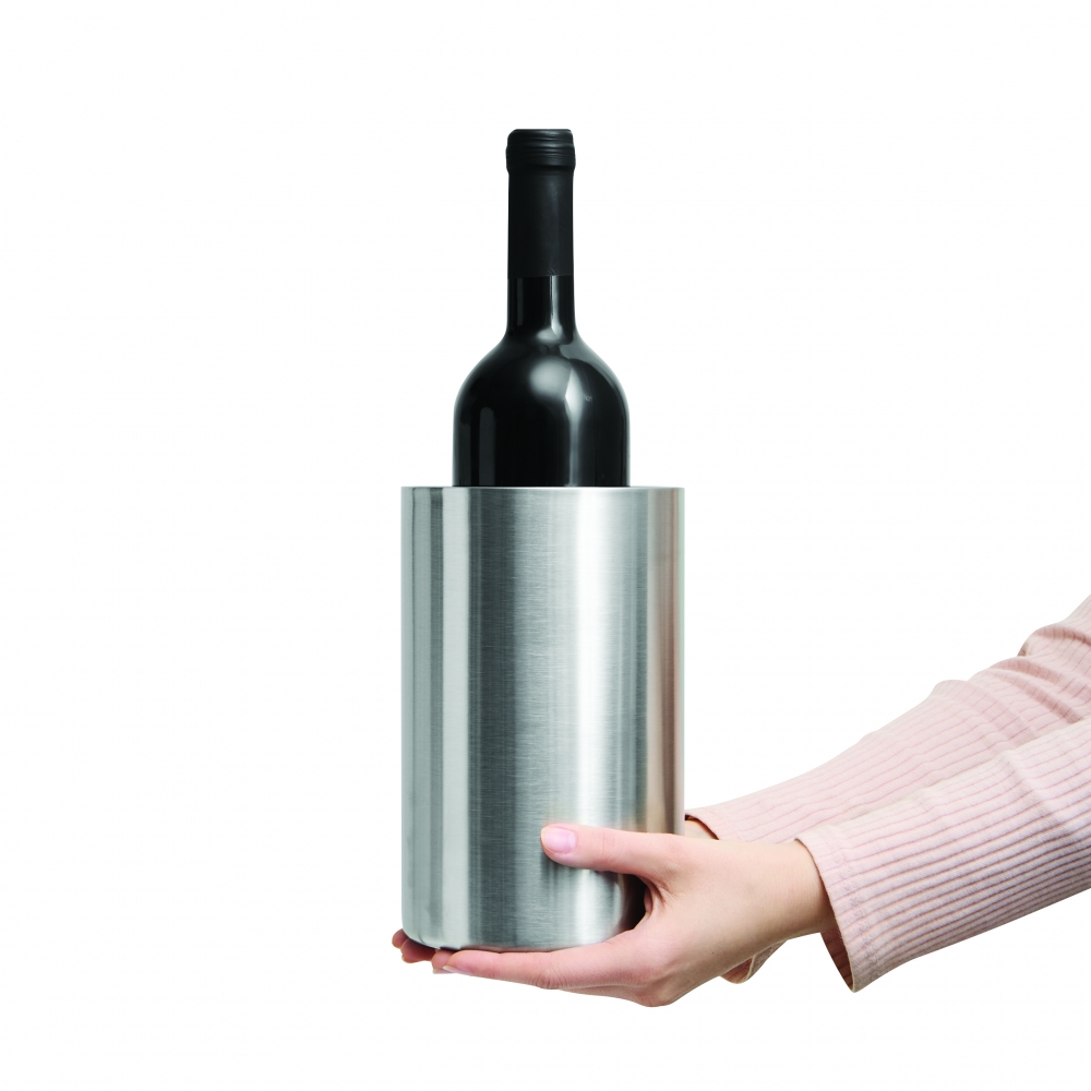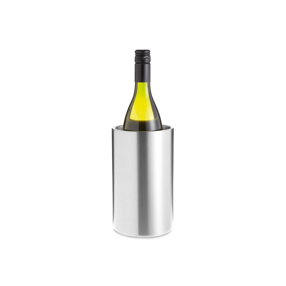 Doppelwandiger Flaschenkühler aus hochwertigem Edelstahl. Hält auch ohne Eiswürfel lange kühl und ist für alle gängigen Flaschenformate geeignet. Dieser Artikel wird per Lasergravur veredelt.