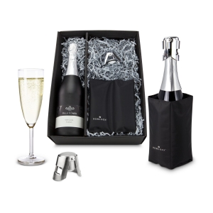 Ein edler Villa Römer Sekt (0,75 l) trocken in schwarz-matter Flasche, kombiniert mit schwarzer Kühlmanschette und Sektverschluss von ROMINOX®. In schwarzem Geschenkkarton.