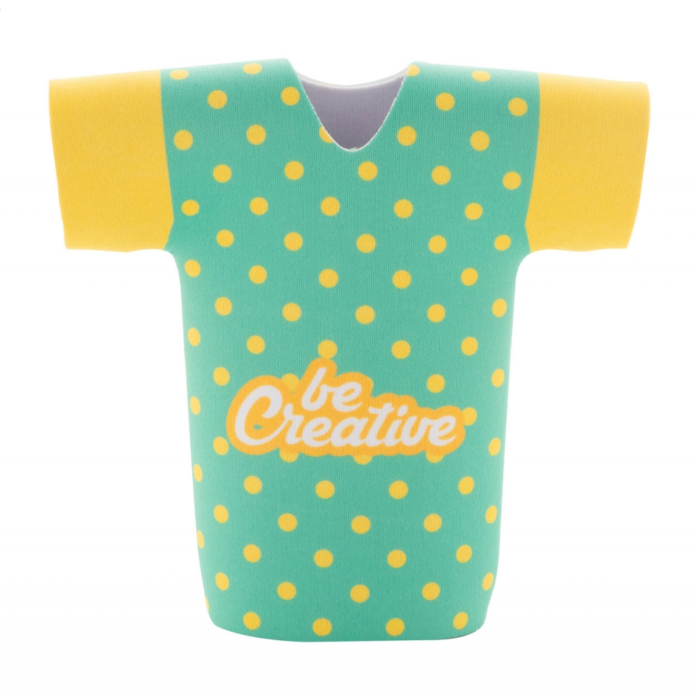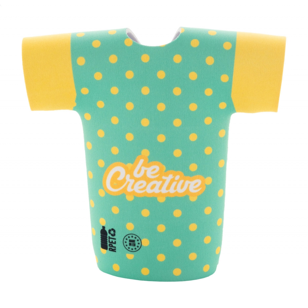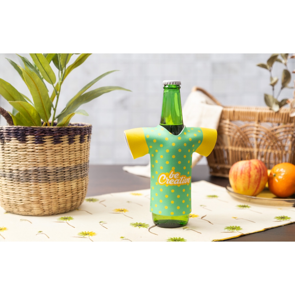Individueller RPET-Neopren-Bierflaschenkühler in T-Shirt-Form. Mit vollflächigem Sublimationsdruck. Mindestmenge: 50 Stk.