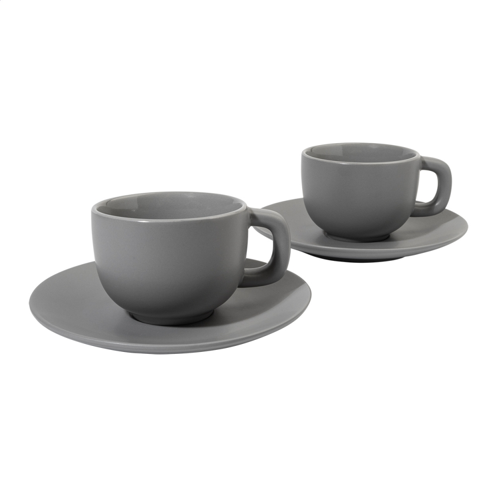 Artikel-Nr: AND800556-77Hochwertiges Cappuccinotassen-Set aus Keramik mit matter Außen- und glänzender Innenseite. Das Set besteht aus aus 2 Tassen (200 ml.) und 2 Untertassen. Verpackt in Kraftpapierbox.