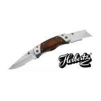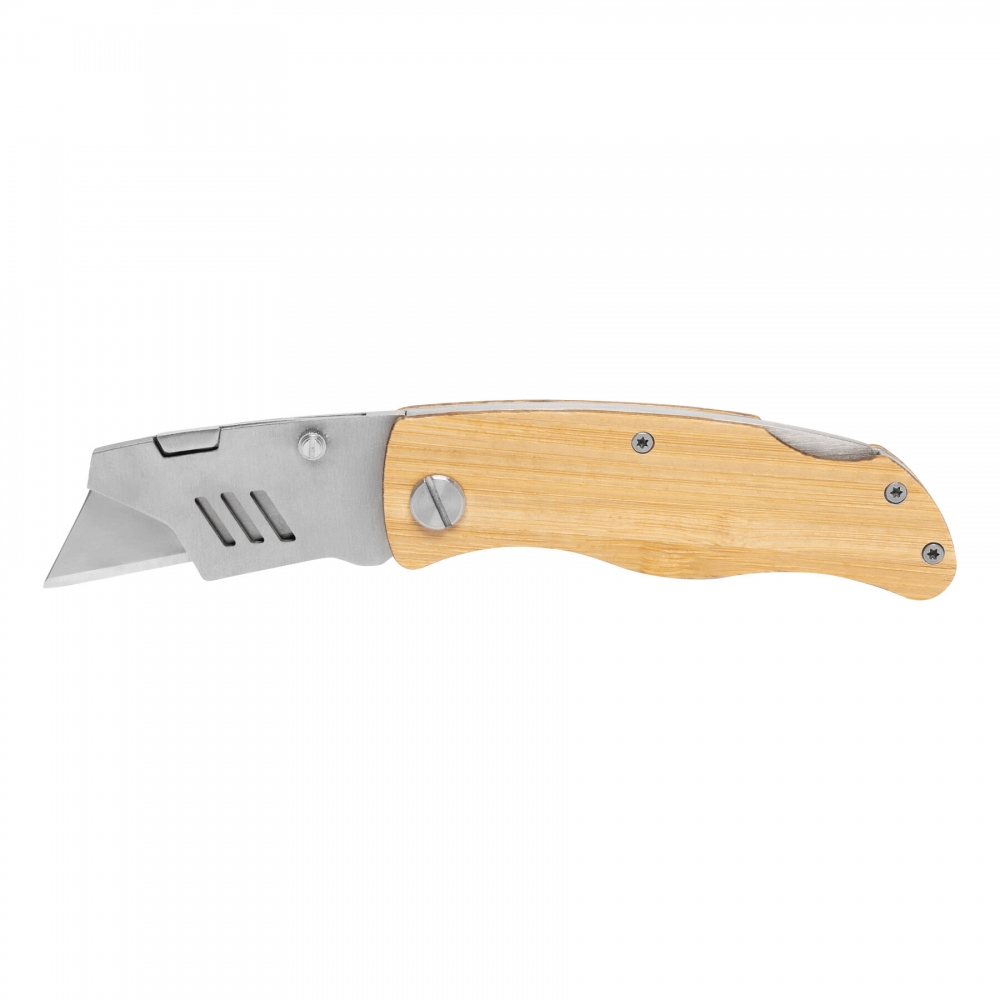 Cuttermesser aus Metall mit Bambusgriff und Sicherheitsverschluss.