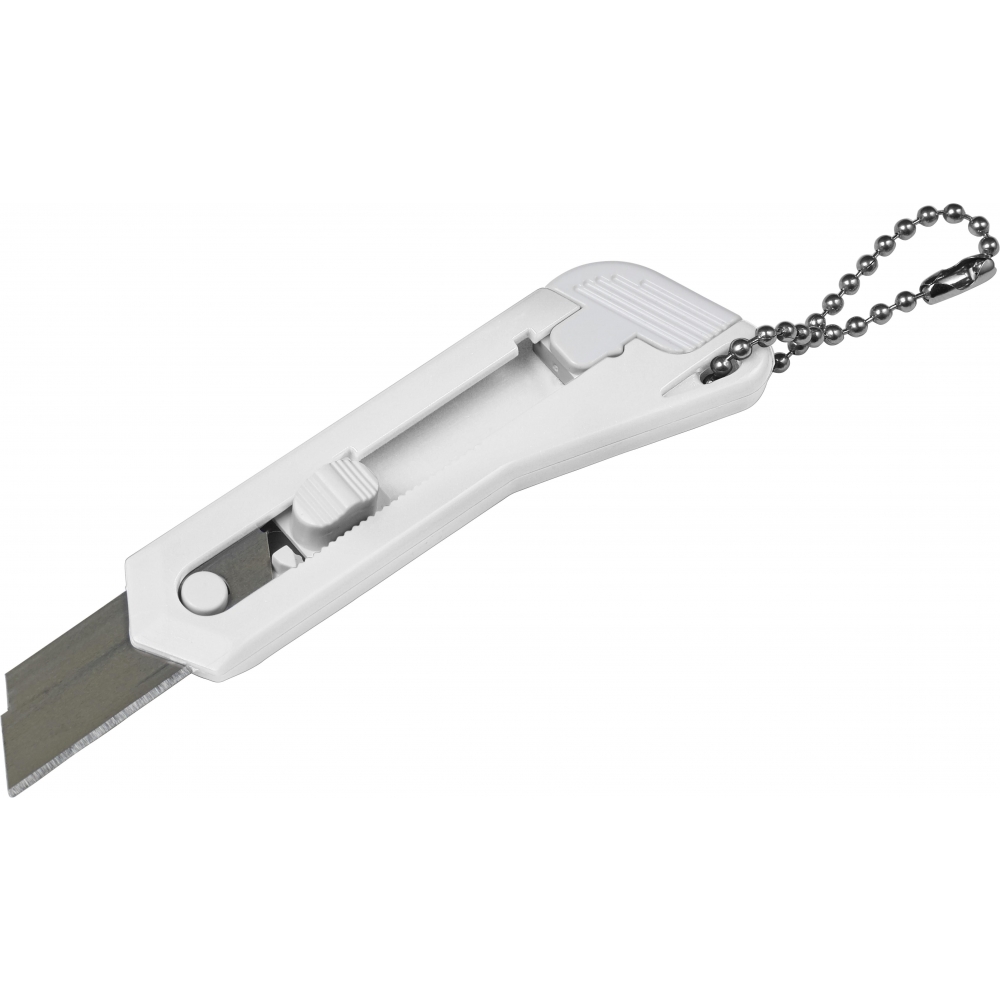 Der Cutter schneidet mühelos verschiedene Materialien wie Kunststoffplatten- und Rohre, Teppich, Kabel, Karton oder Gips. Der Cutter mit weißem Kunststoffgriff und 18 mm breiter/ 0,6 mm dünner Carbon-Stahlklinge mit schwarzer Beschichtung hat eine Druckbelastung bis zu 25 kg. Durch die lasergeschnittene Klinge ist der Cutter extrem scharf. Die Werbeanbringung kann als Doming oder Tampondruck auf dem Griff platziert werden.