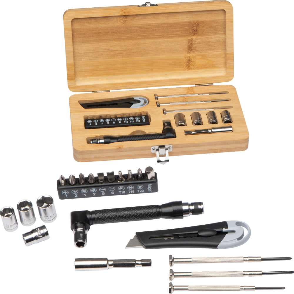 21-tlg. Werkzeugset aus Metall in einer Bambusschachtel. Beinhaltet: 1 Steckschlüssel, 1 Cuttermesser, 3 Präzisionsschraubendreher, 10 Bits im Halter, 4-tlg. Steckschlüssel-Nussset und 1 Verlängerung.