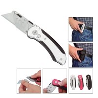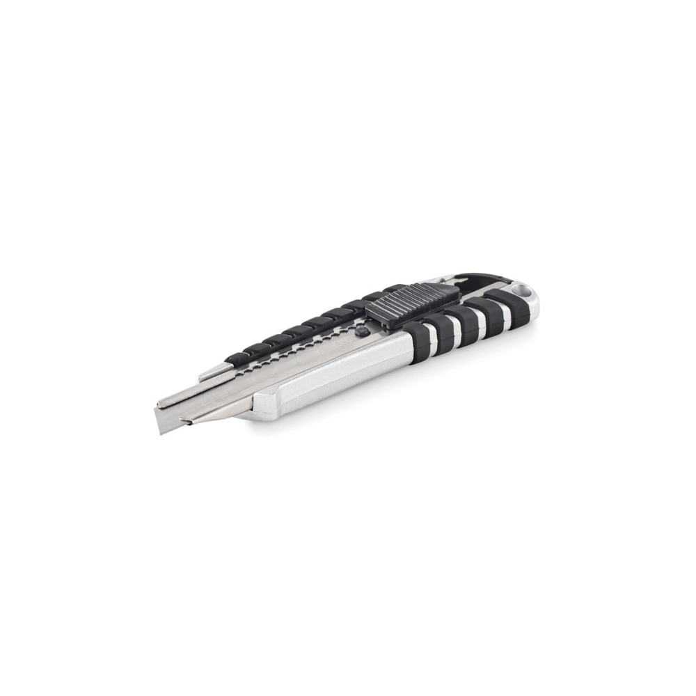 Professionelles Cuttermesser mit Feststellung der Klinge und selbstladendem Magazin. Stabile Metallführung, M3 Abbrechklingen aus Stahl, Griff und Magazin aus ABS und TPR. Werbefläche im Griff. Inkl. 3 Klingen.
