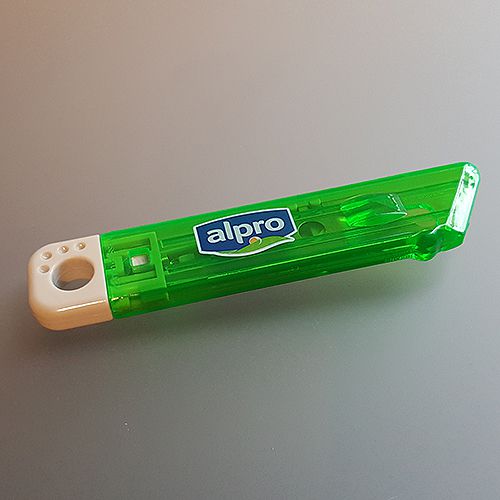 Schlankes Kartonmesser aus Kunststoff in vielen kräftigen Farben mit abtrennbarer Feststellklinge. Ihren gewünschten Werbedruck platzieren wir mittig auf den Cutter.