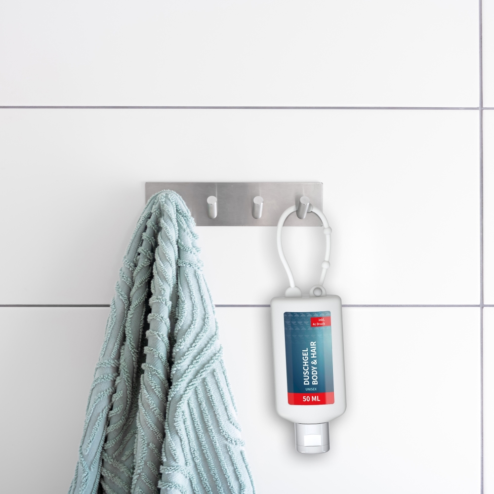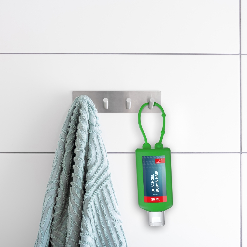 Praktische Kosmetikflasche zum Anhängen! Das Fläschchen mit Silikonhülle ist nicht nur optisch ein echter Hingucker! Raffiniert mit Schlaufe zum Anhängen an den Rucksack, an die Sporttasche, an den Kinderwagen oder natürlich im Bad unter der Dusche. 50 ml Flasche aus 100% recyceltem PET, transparent mit leichter R-PET-Färbung. Mit Klappdeckel "weiß" aus recyceltem PP, zufällig ausgerichtet; Silikonhülle und Schlaufe in Nachfüllbar. Das Body & Hair Duschgel mit dem Mix aus Ingwer und Limette sorgt mit seinem spritzigen Duft für Frische über den ganzen Tag und macht das Duschen zum Erleb ...