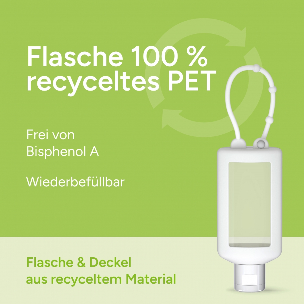 Praktische Kosmetikflasche zum Anhängen! Das Fläschchen mit Silikonhülle ist nicht nur optisch ein echter Hingucker! Raffiniert mit Schlaufe zum Anhängen an den Rucksack, an die Sporttasche, an den Kinderwagen oder natürlich im Bad unter der Dusche. 50 ml Flasche aus 100% recyceltem PET, transparent mit leichter R-PET-Färbung. Mit Klappdeckel "weiß" aus recyceltem PP, zufällig ausgerichtet; Silikonhülle und Schlaufe in Nachfüllbar. Das Body & Hair Duschgel mit dem Mix aus Rosmarin und Ingwer regt mit seinem umwerfend würzig-frischen Duft die Sinne an und macht das Duschen zum Erlebnis! Es ...