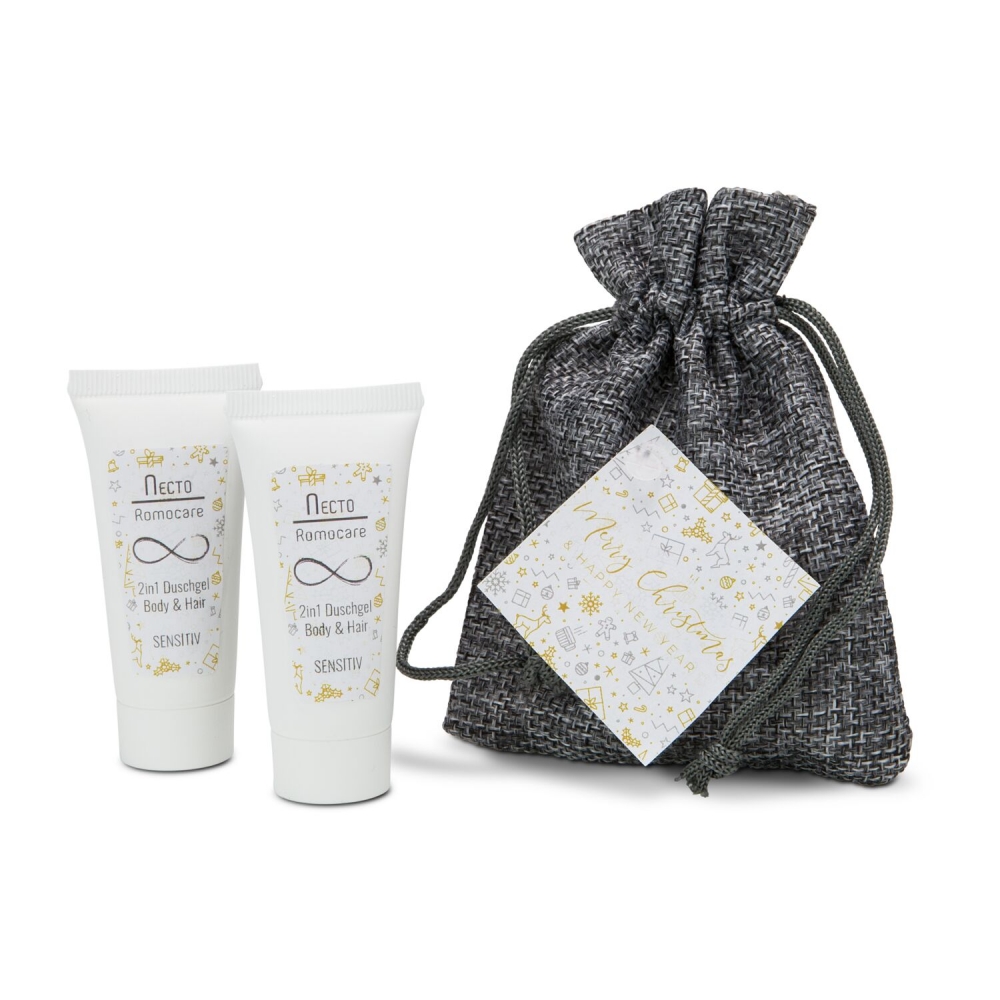 Kundenpflege als kleine Geste der Wertschätzung zu Weihnachten. Hier erhalten Sie 2in1 und das im Doppelpack. 2 Tuben Duschgel Body & Hair Sensitiv (je 20 ml) sind liebevoll verpackt in einem kleinen, grauen Säckchen mit weihnachtlichem Geschenkanhänger, der auf der einen Seite "Merry Christmas" und auf der anderen "Frohe Weihnachten" wünscht. Ideal für den Urlaub oder die nächste Geschäftsreise - oder einfach als nette Aufmerksamkeit. Auf Wunsch auch mit individuellem Anhänger.