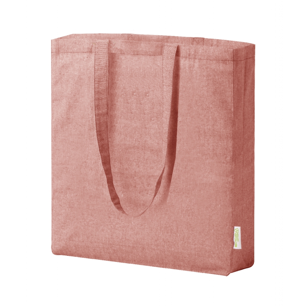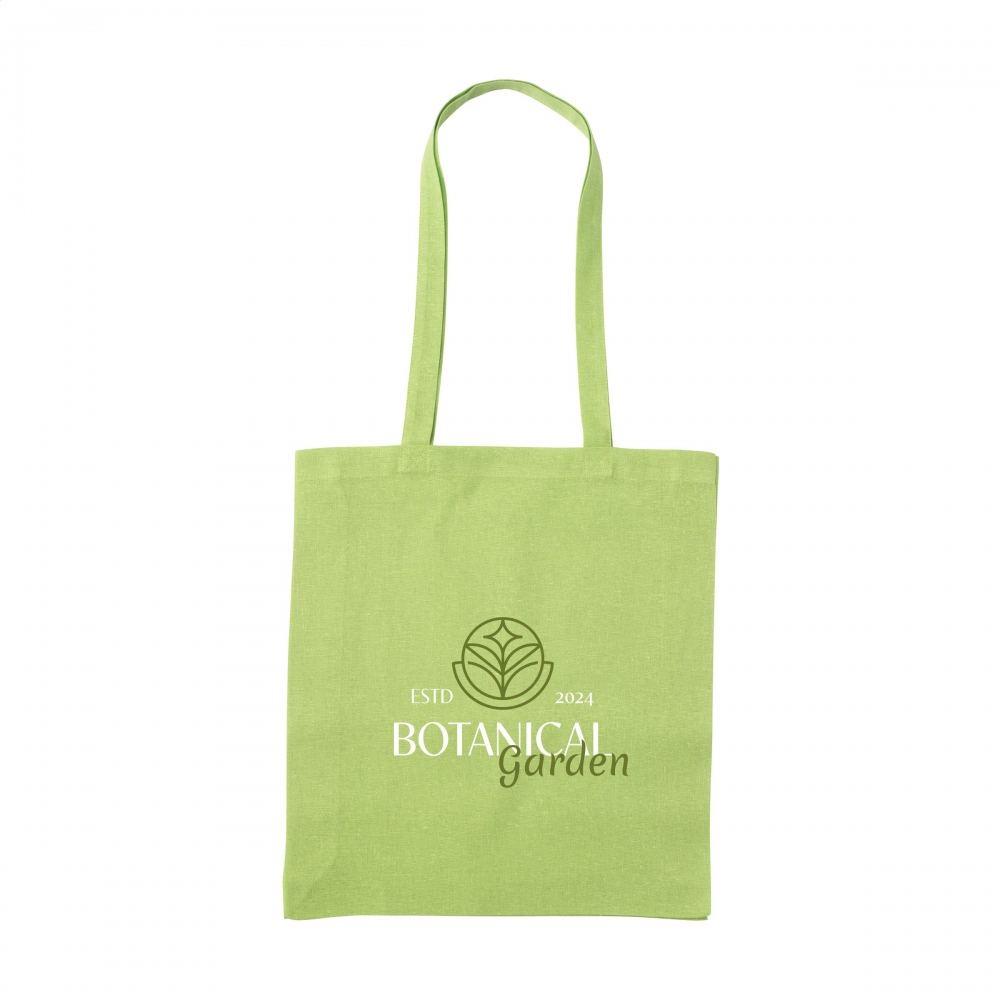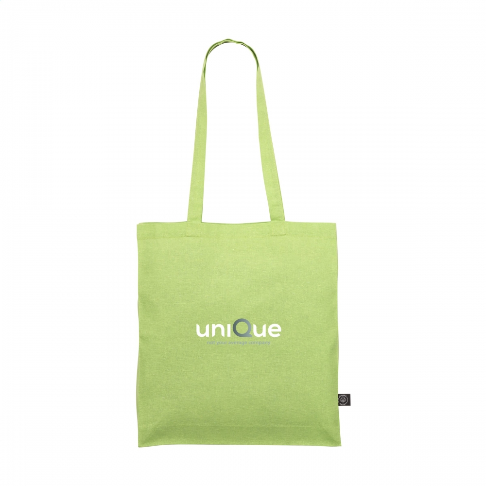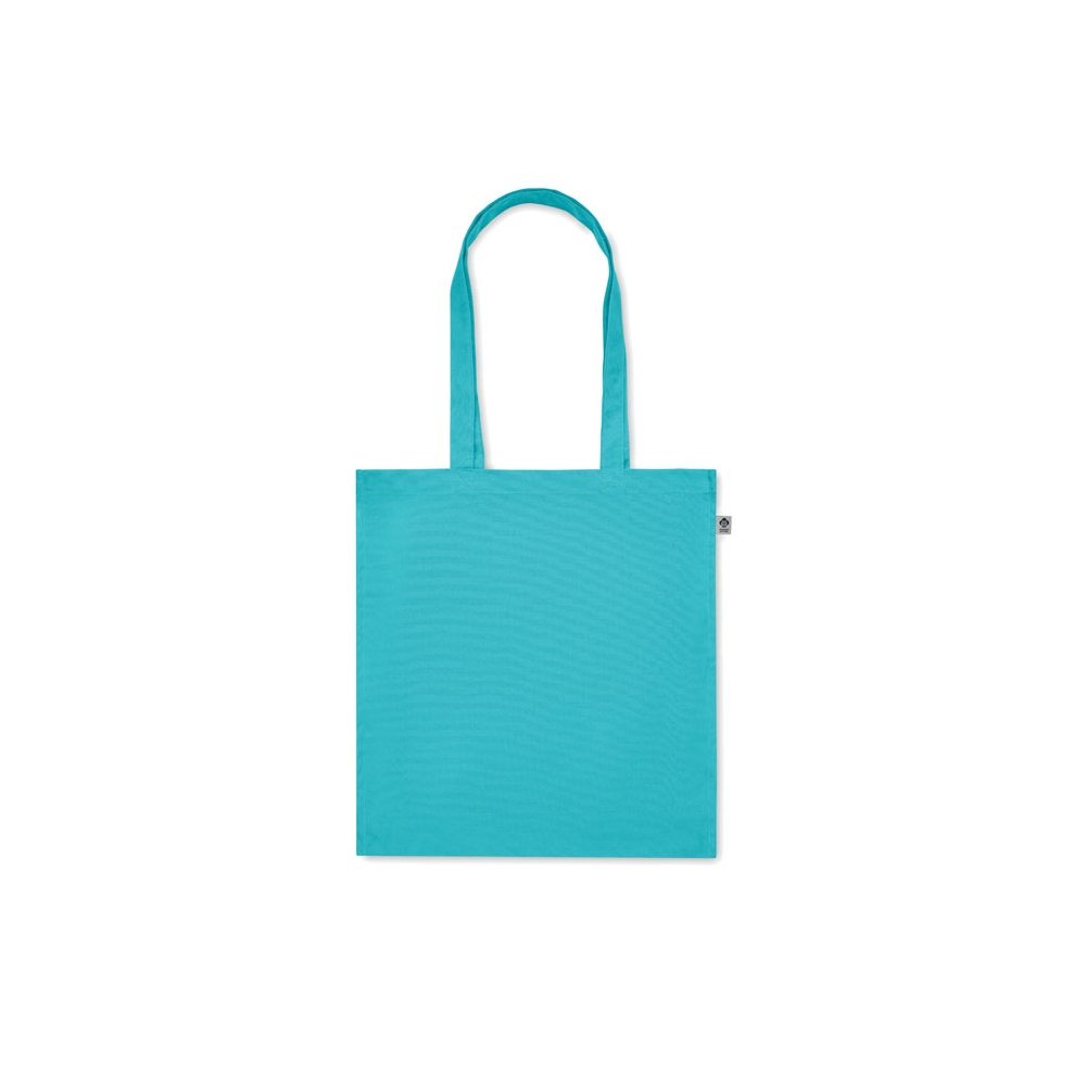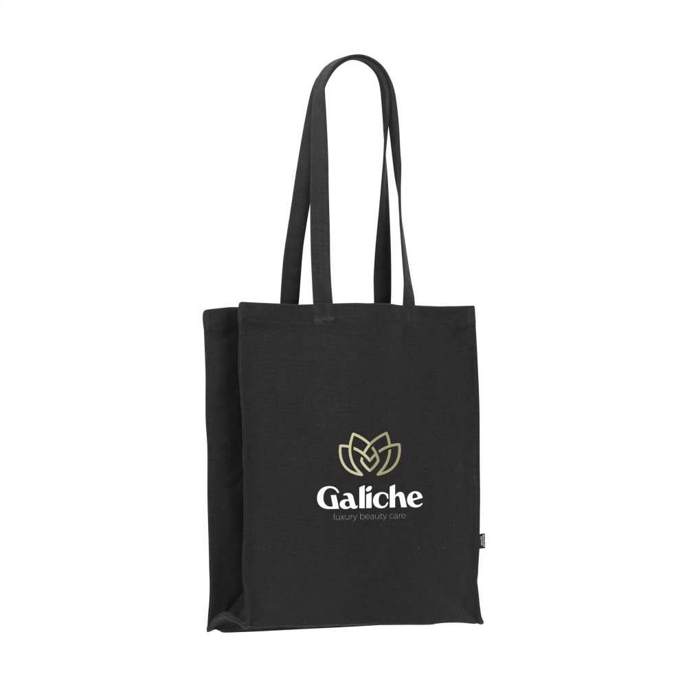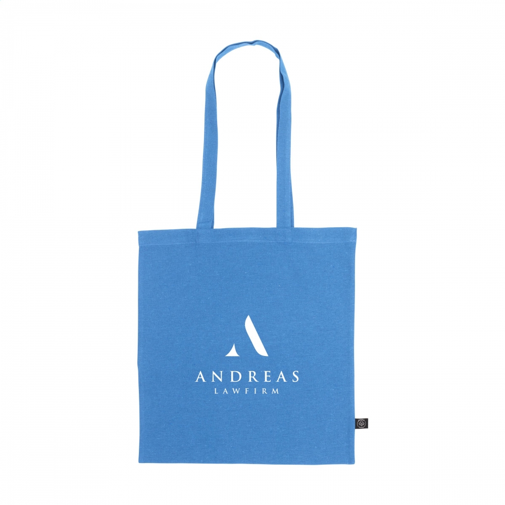 Oeko-Tex® STANDARD 100 zertifizierte Einkaufstasche aus recycelter Baumwolle mit langen Tragehenkeln und einer Grammatur von 140g / m². Die Werbung wird auf eine Seite der Tasche gedruckt.