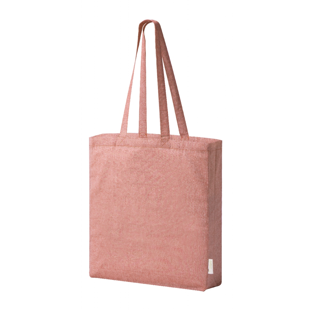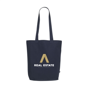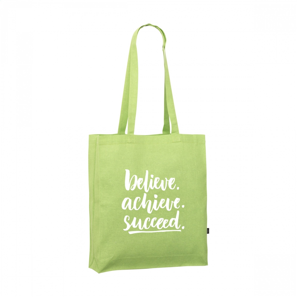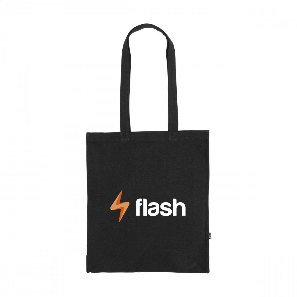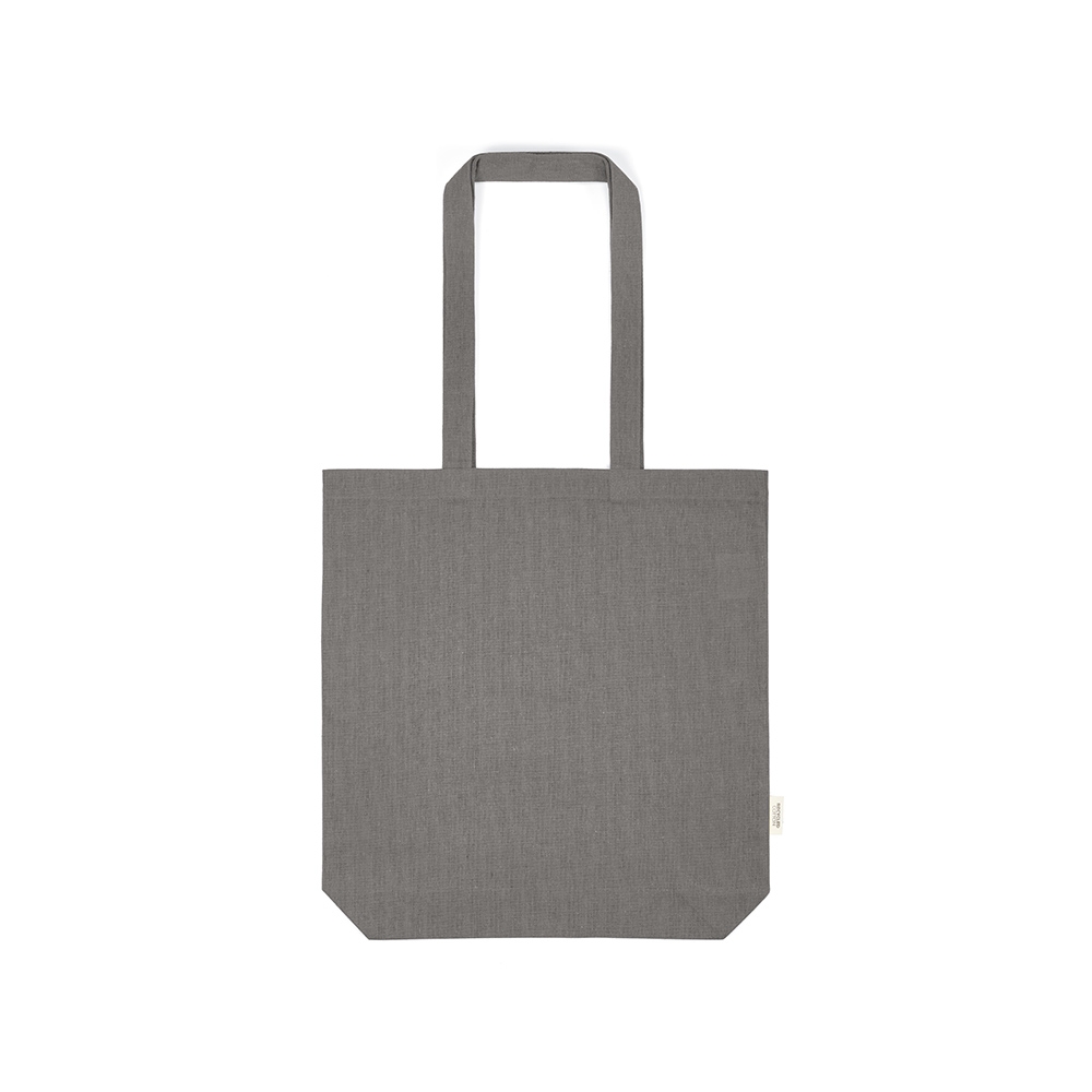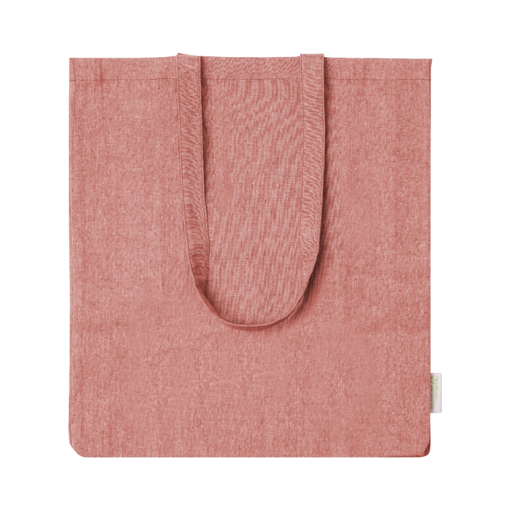Oeko-Tex® STANDARD 100 zertifizierte Einkaufstasche aus recycelter Baumwolle mit langen Tragehenkeln und einer Grammatur von 140g / m². Die Werbung wird auf eine Seite der Tasche gedruckt.