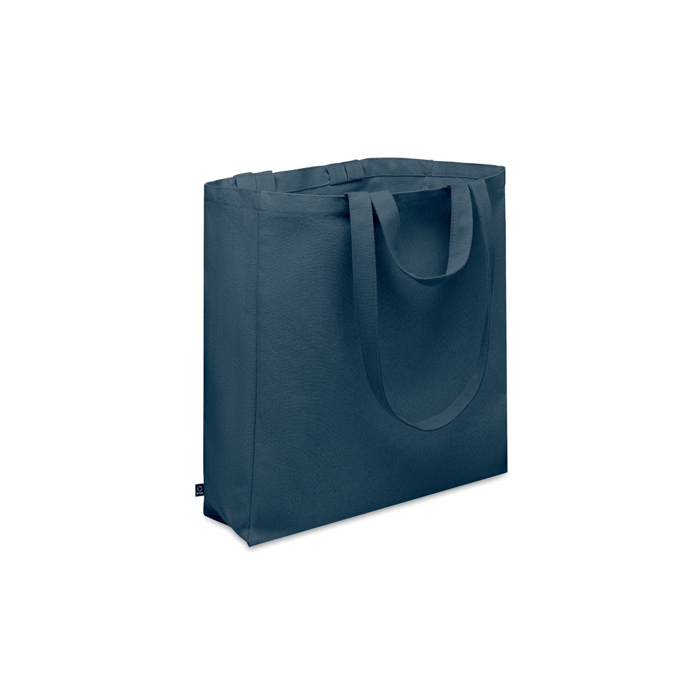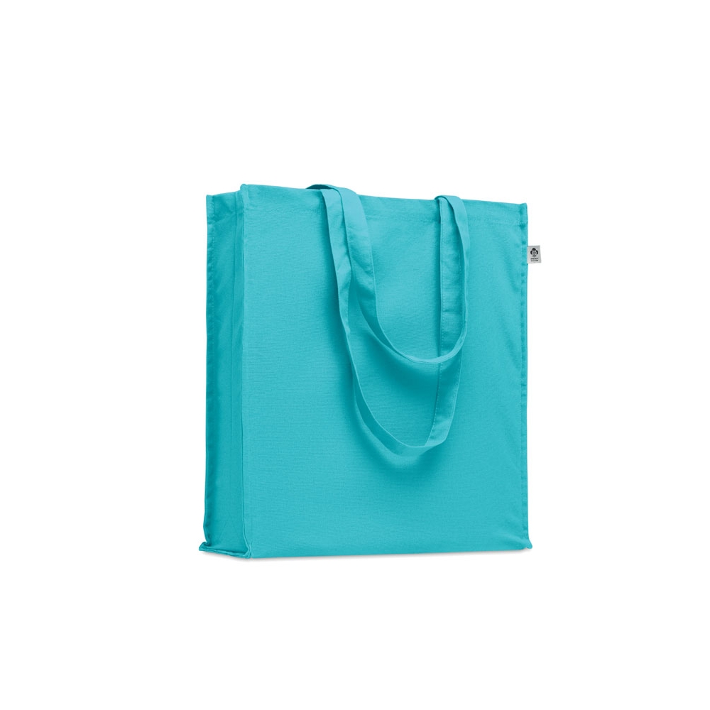 Einkaufstasche mit Seitenfalte aus recycelter Baumwolle und langen Henkeln. Material: 100 % recycelte Baumwolle, 140 g / m². MIt Label Recycelte Baumwolle.