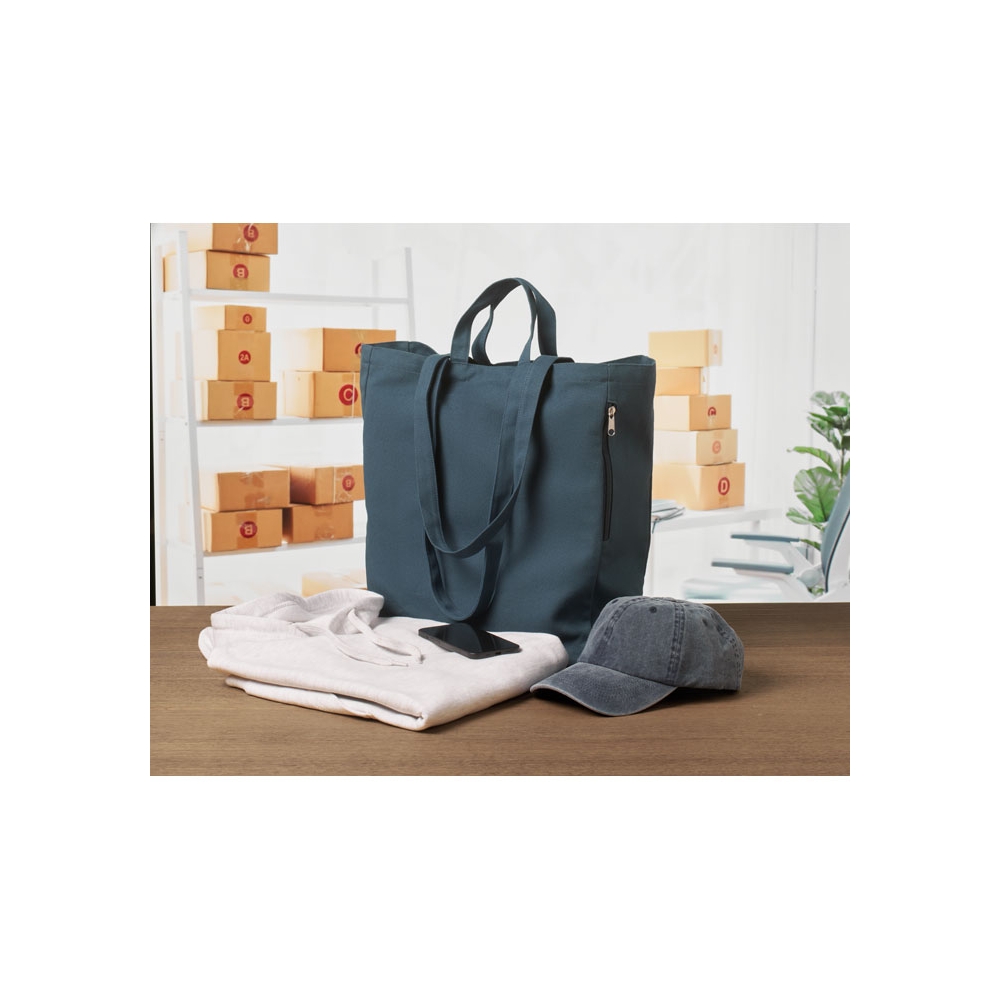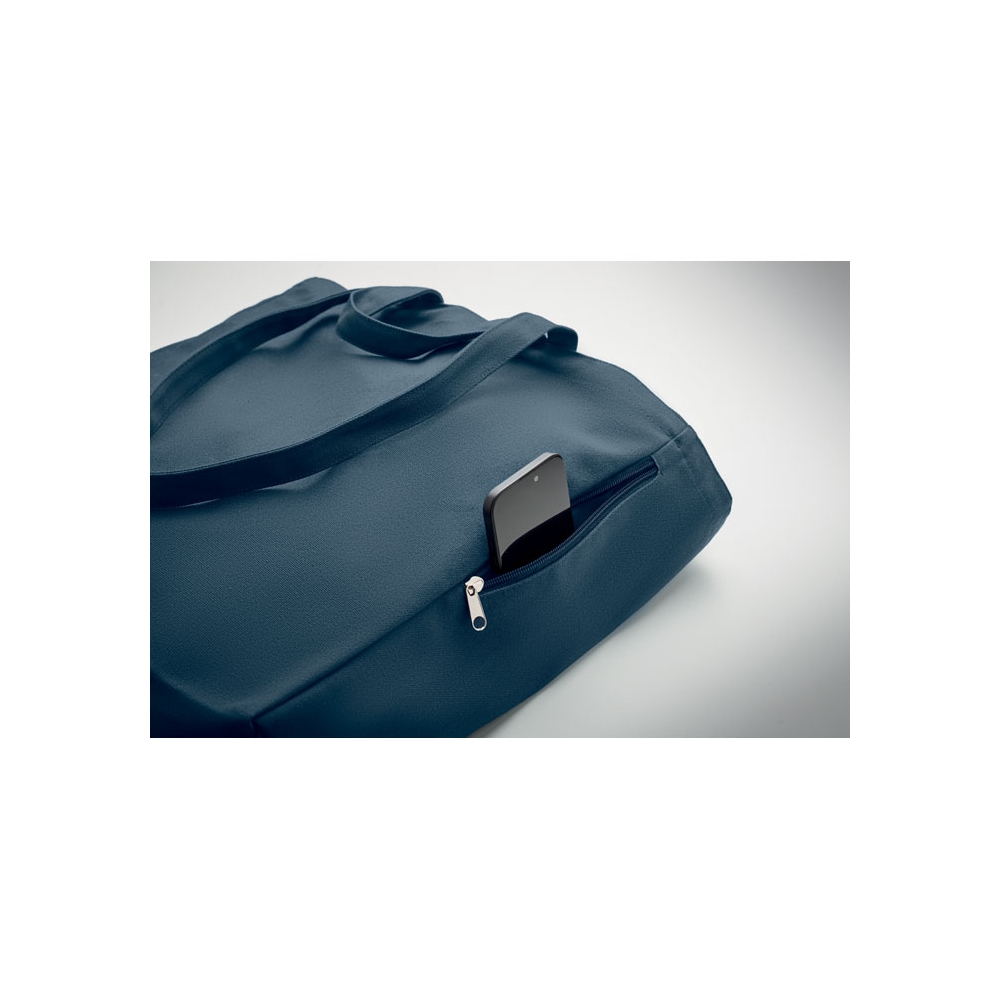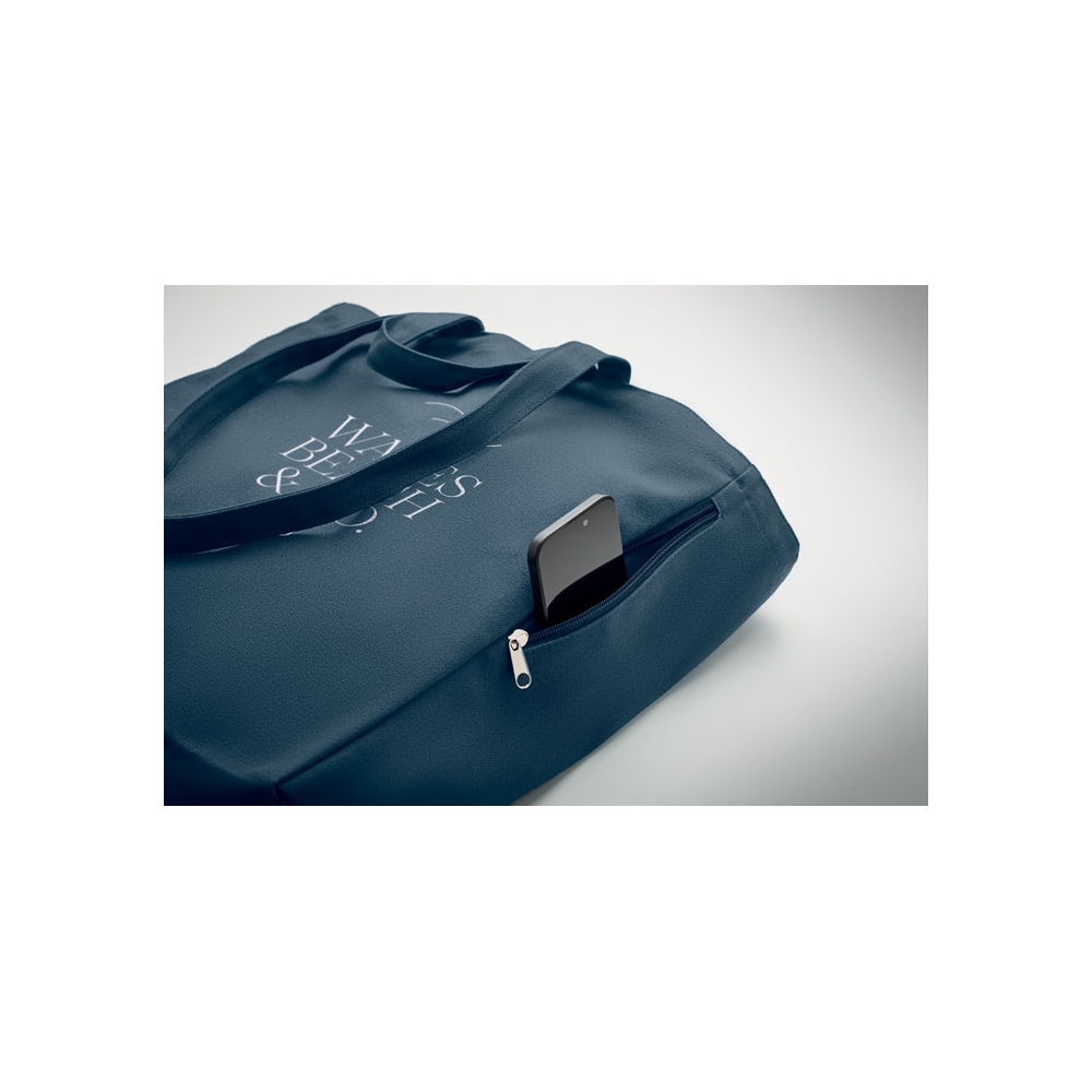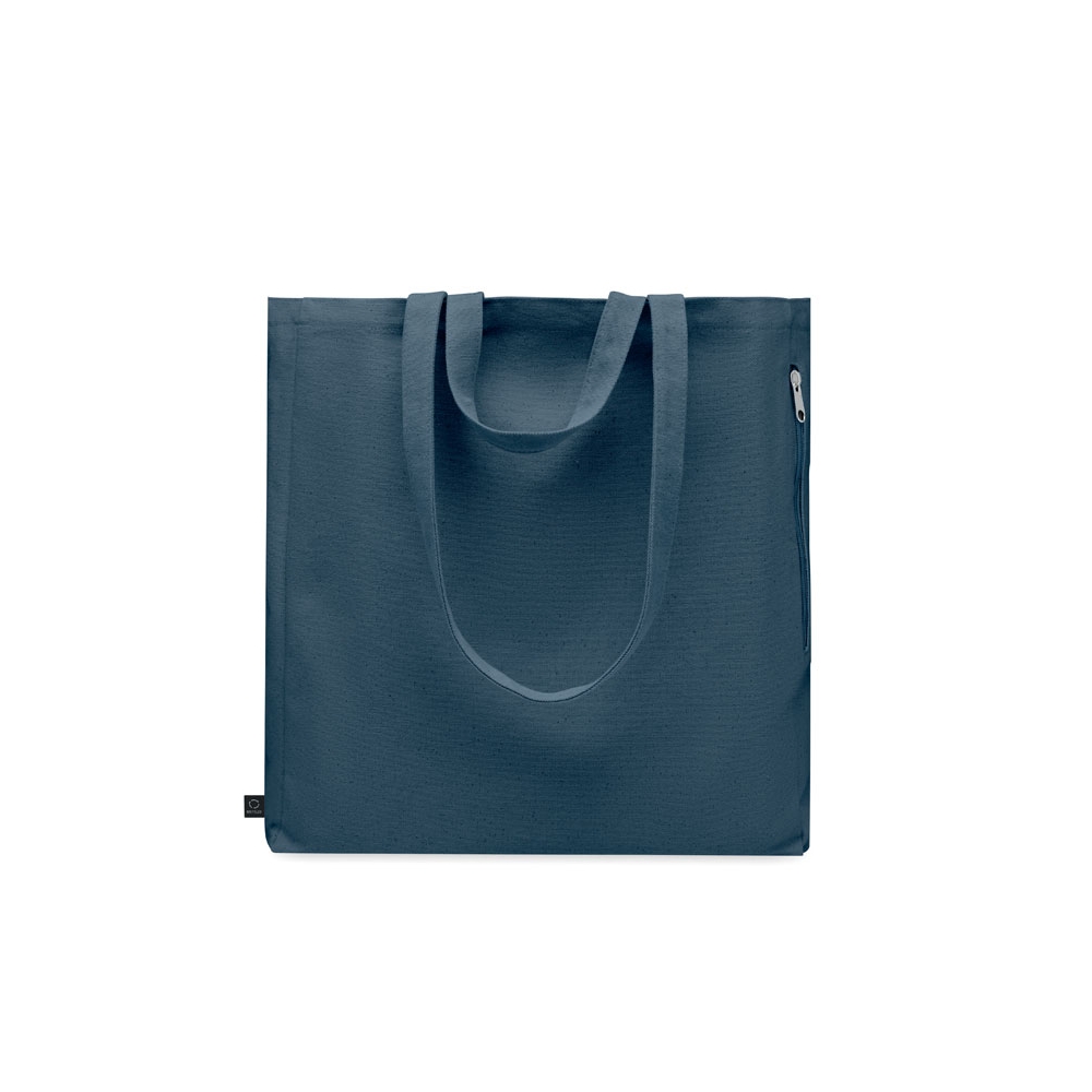 Einkaufs- oder Strandtasche aus recyceltem Polycotton (70 % recycelte Baumwolle, 30 % recycelter Polyester) mit kurzen Tragegriffen. Innentasche mit Reißverschluss. 380 g / m².