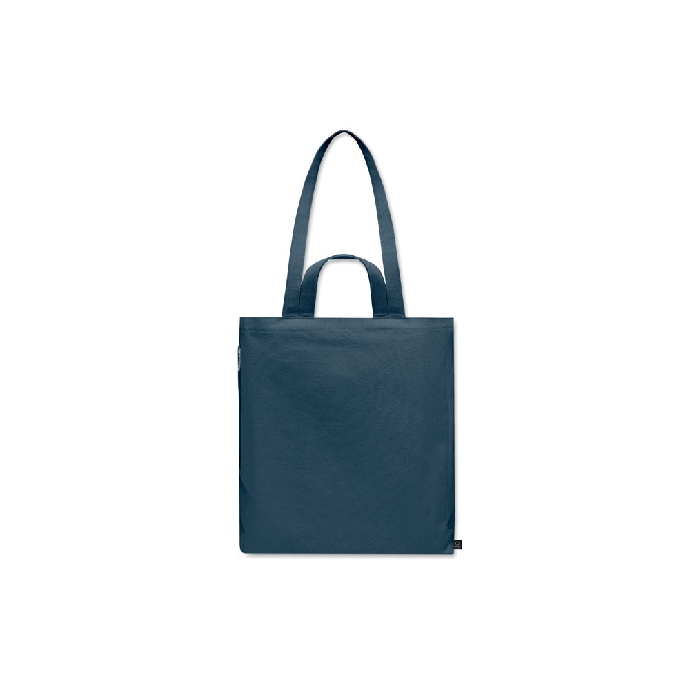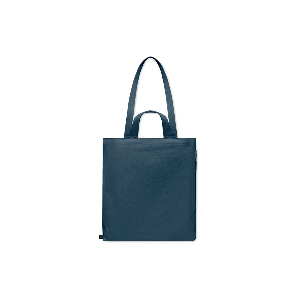 Faltbare Einkaufstasche aus recycelter Pre-Consumer-Baumwolle (70% recycelte Baumwolle und 30% RPET). 140 g / m². Artikel kann nach dem Bedrucken schrumpfen.