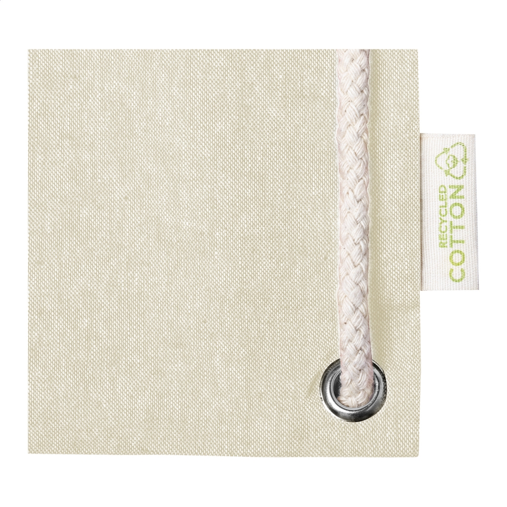 Turnbeutel aus recycelter Baumwolle mit dicken geflochtenen Kordeln und langen Griffen. Auch verwenbar als Einkaufstasche. Material: 100% recycelte Baumwolle (140 g / m²).