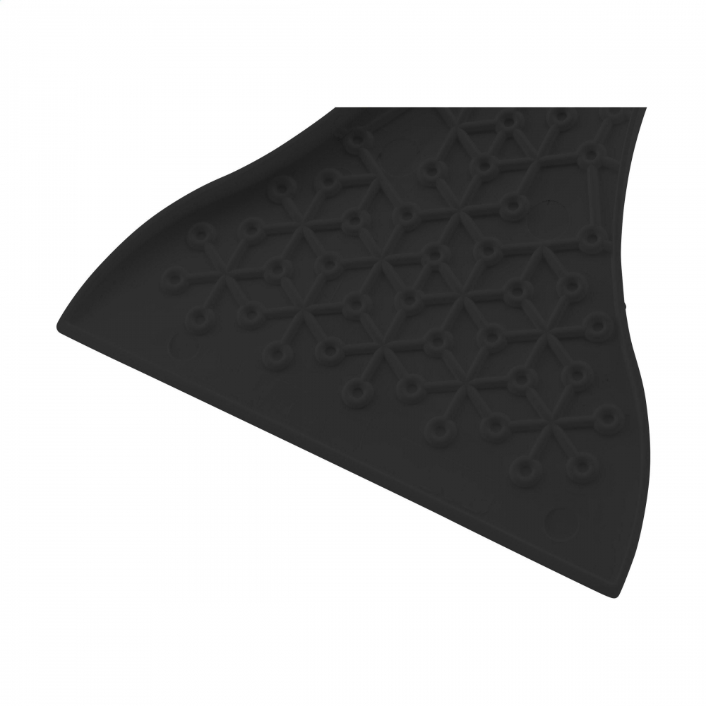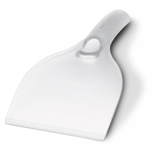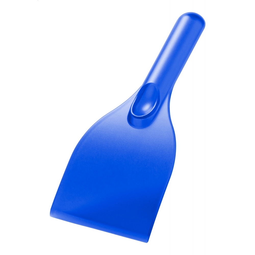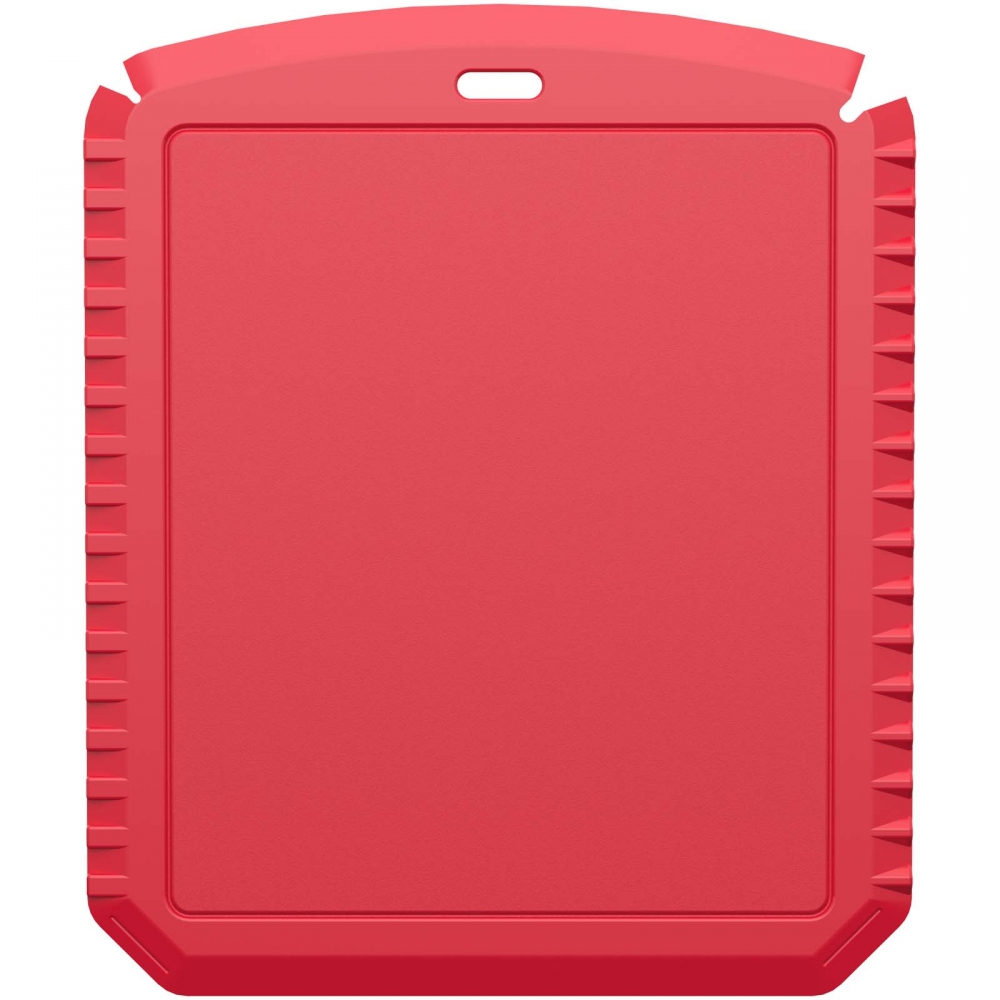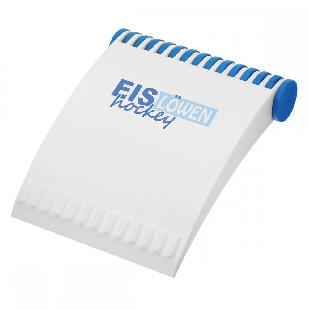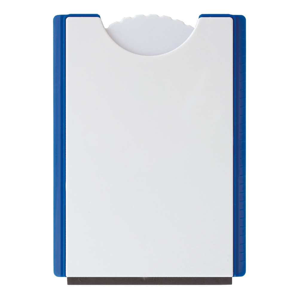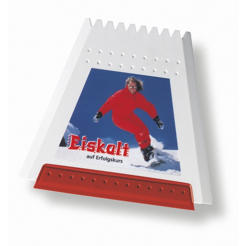 Flacher, rechteckiger Eiskratzer mit großer Werbefläche, Kratzzähnen und glatter Kratzkante. IMould-Veredelung möglich.
