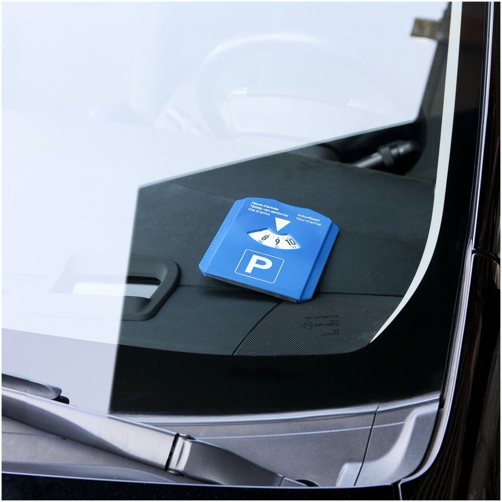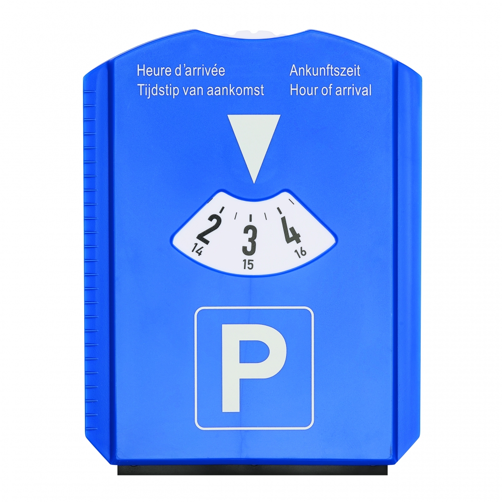 Parkscheibe mit Eiskratzer, Gummiwischer, Einkaufswagen Chip und Reifenprofilmesser. Großer weißer Logobereich auf der Rückseite. "Ankunftszeit" auf der Vorderseite in den Sprachen Niederländisch, Englisch, Französisch, Deutsch und Italienisch. Vorschriften können sich je nach Ort unterscheiden.