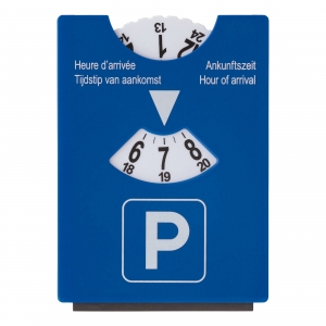 Euro-Parkscheibe aus Kunststoff, Eiskratzerfunktion mit Gummilippe, Vorderseite 4-sprachig deutsch, französisch, niederländisch, englisch, 2 integrierte blaue Chips (1 €-Größe) ca. 12 x 15,2 cm, 200 Stück im Karton, UV 50 Stück
