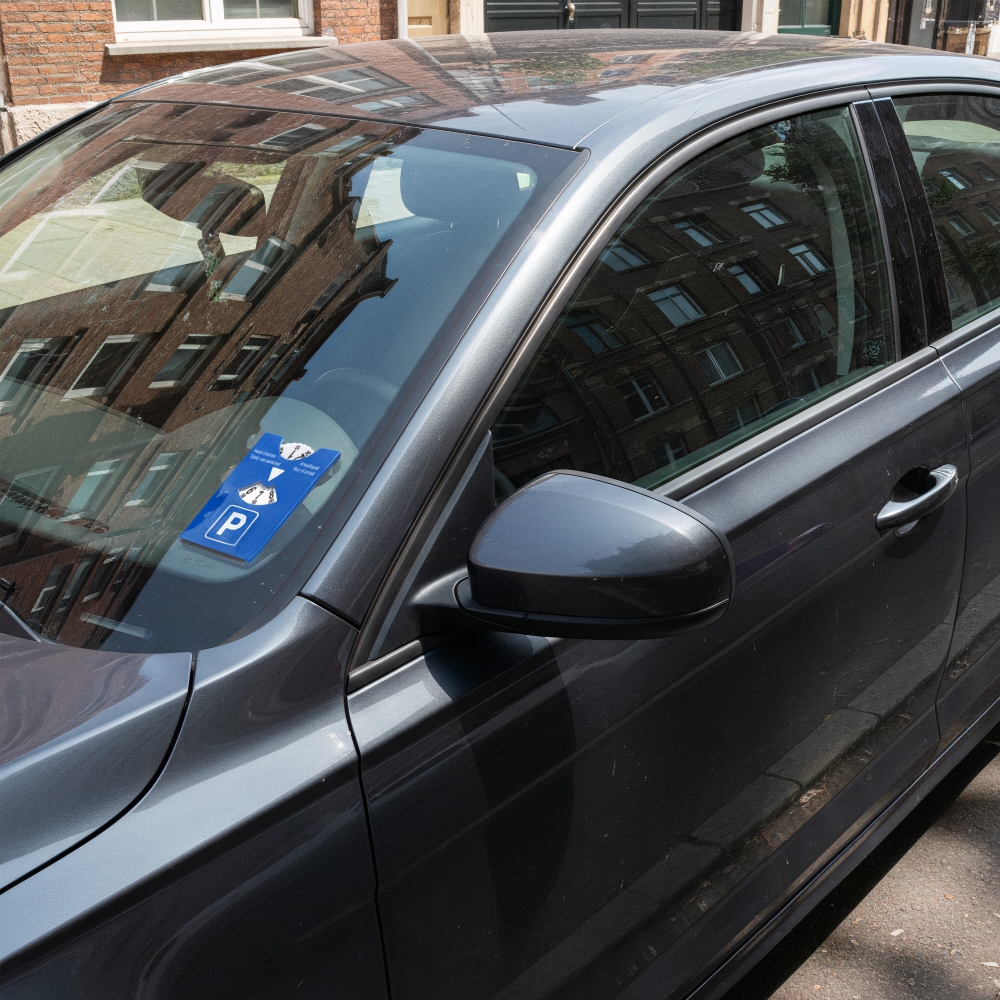 Parkscheibe und Eiskratzer im Toppoint-Design. Die Parkscheibe entspricht den europäischen Gesetzen (außer Frankreich). Die blaue Seite ist eine normale Parkscheibe, die grüne Seite kann beim Aufladen Ihres Elektro- oder Hybridautos verwendet werden.