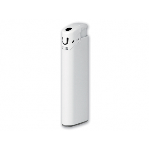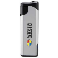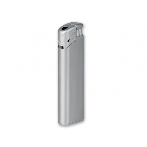 Flaches, elektronisches und nachfüllbares Feuerzeug in matt-silber mit Kindersicherung. Maße: 81 x 24 x 9 mm. Farbe/n: Gold, Silber. Werbeanbringung: 55 x 13 mm.