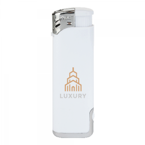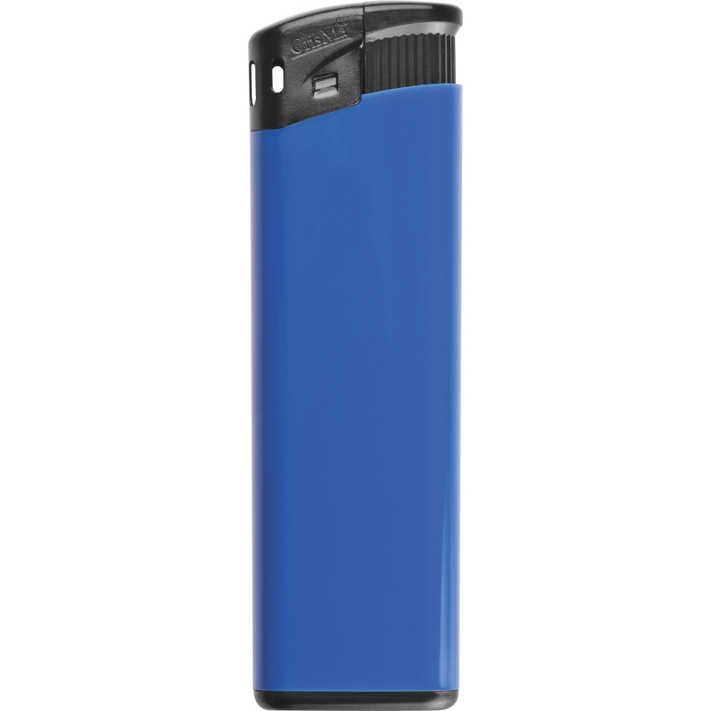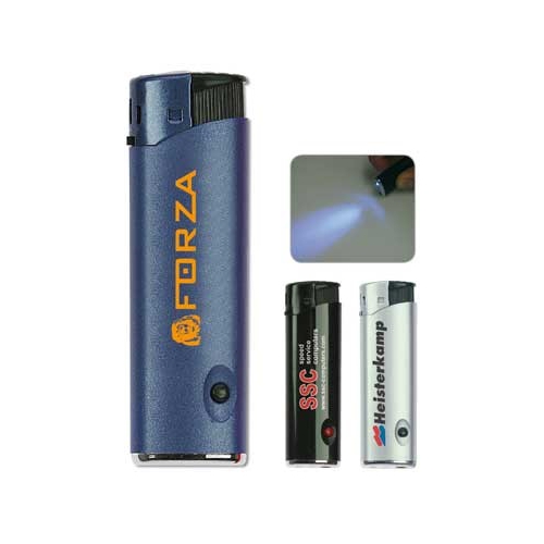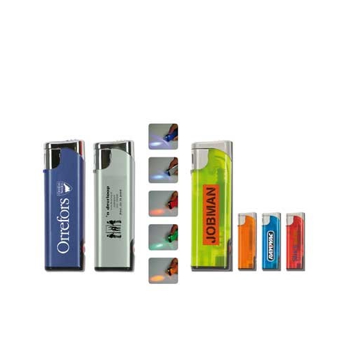 Elektronisches, nachfüllbares Feuerzeug in Metallicfarben mit LED-Licht und Kindersicherung. Maße: 82 x 25 x 13 mm. Express-Lieferung möglich. Farbe/n: Schwarz, Silber/Blau, Silber/Silber. Werbeanbringung: 35 x 12 mm.