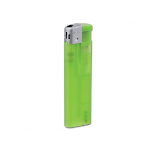 Elektronisches, nachfüllbares Feuerzeug in gefrosteten Farben mit matt silberner Kappe. Mit Kindersicherung.
