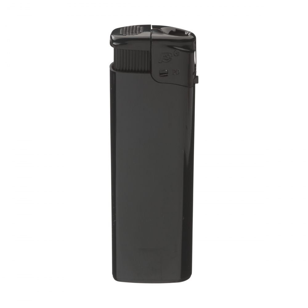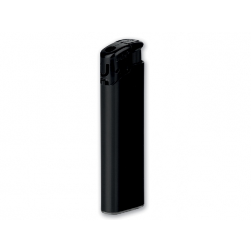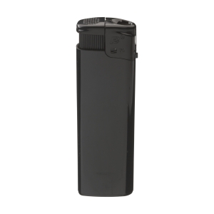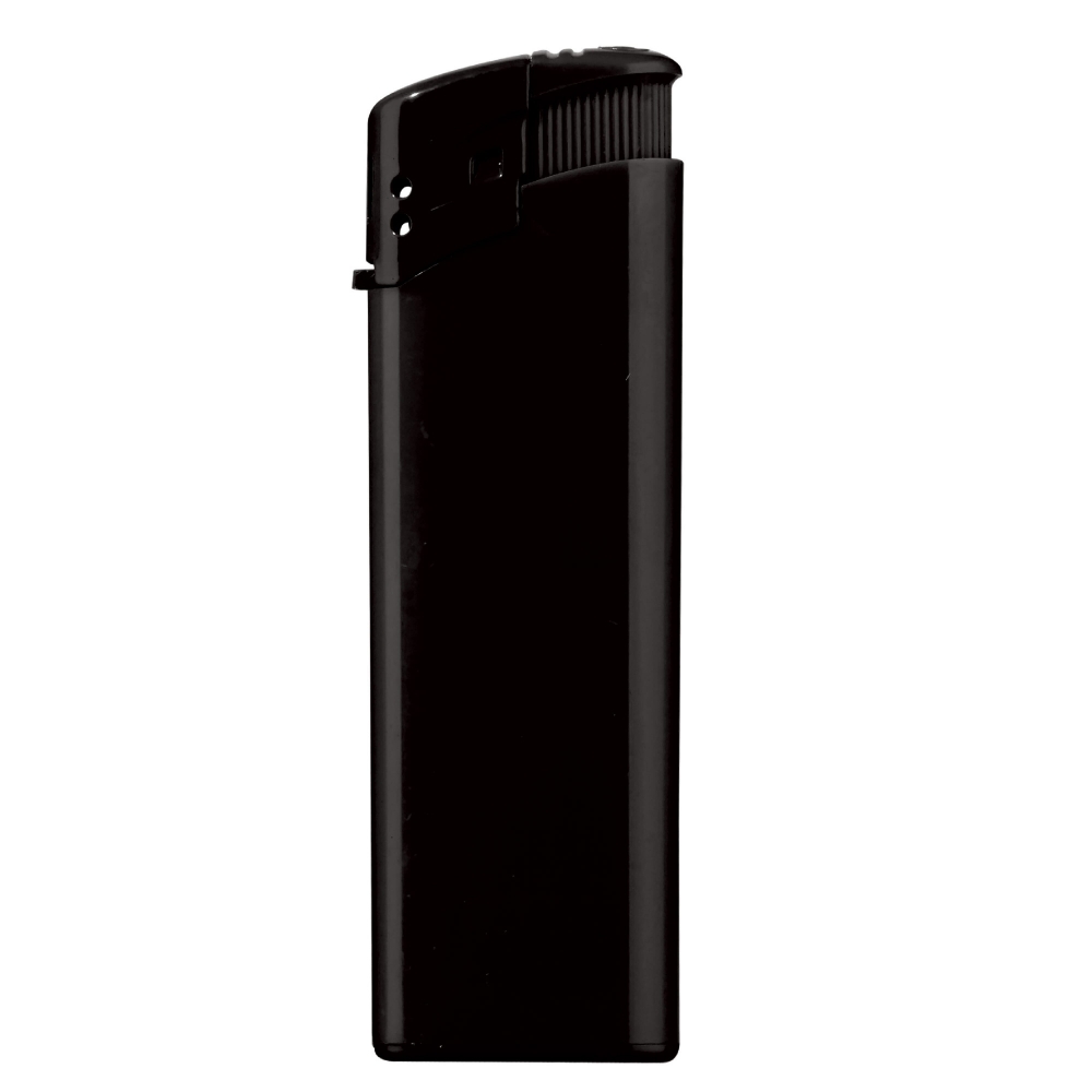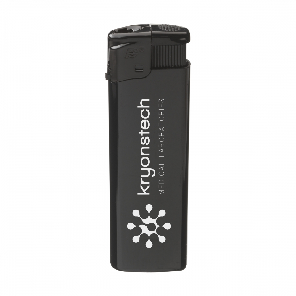 Elektronik-Feuerzeug mit schwarzem Kopf, nachfüllbar. Die Sturmflamme lässt sich stufenlos verstellen. Ihr Werbeaufdruck erfolgt auf einer Seite.